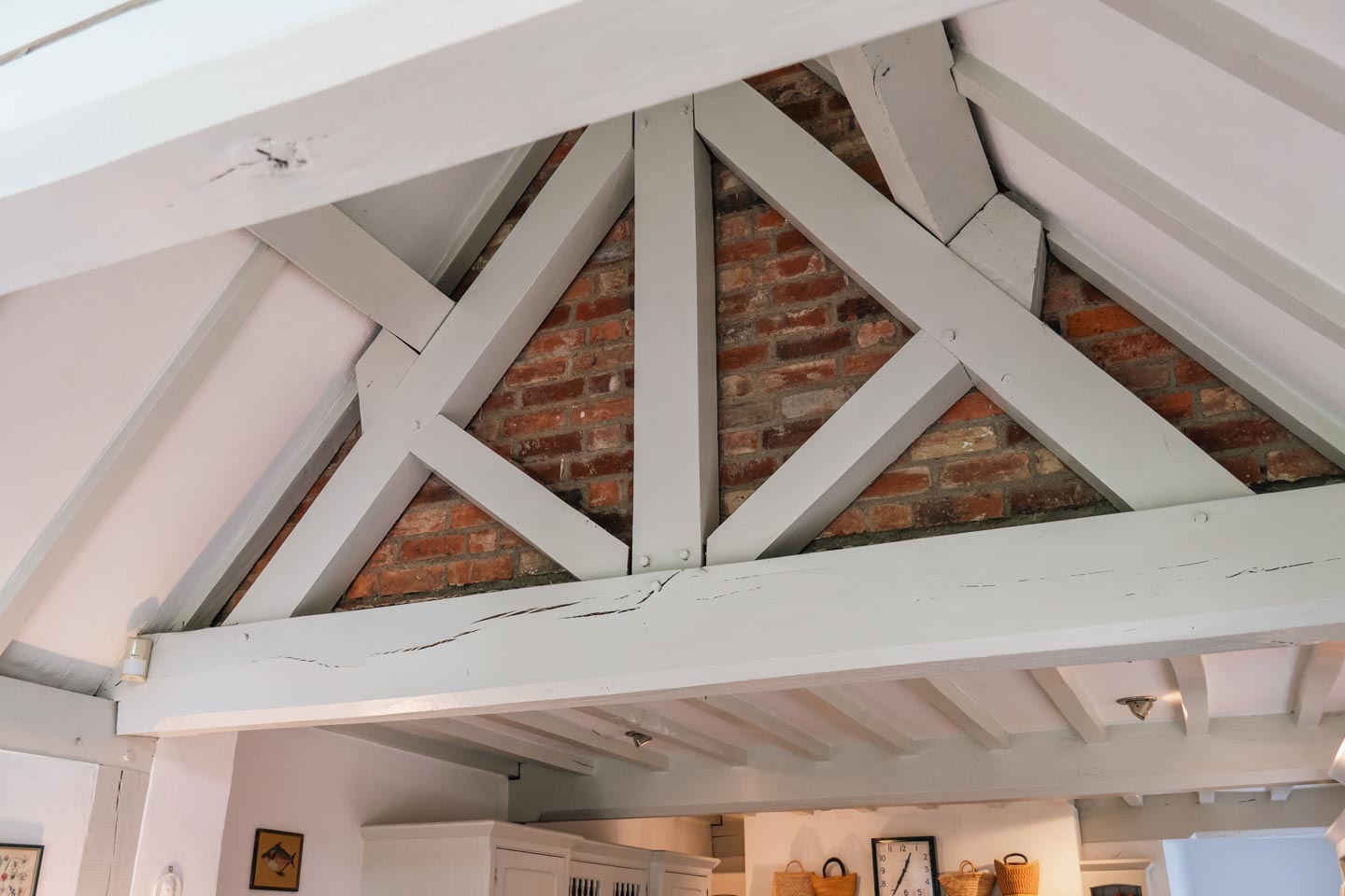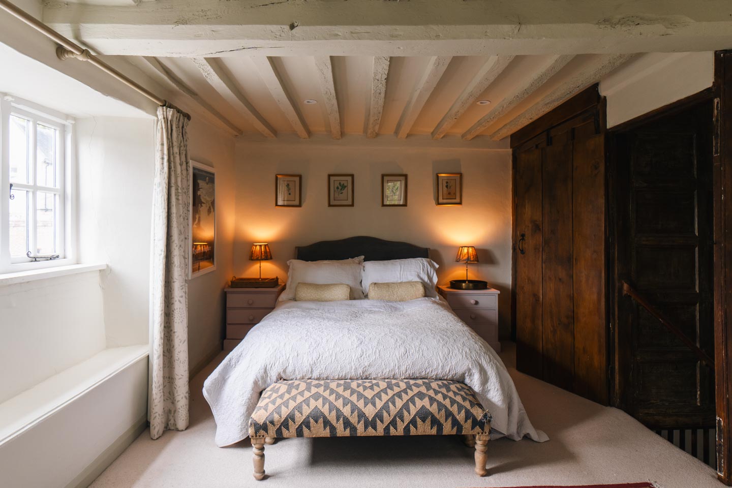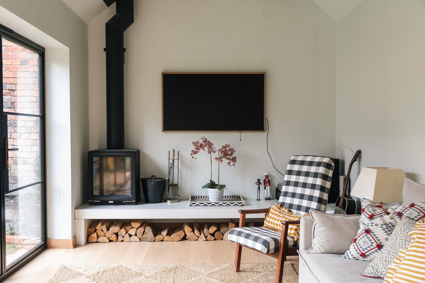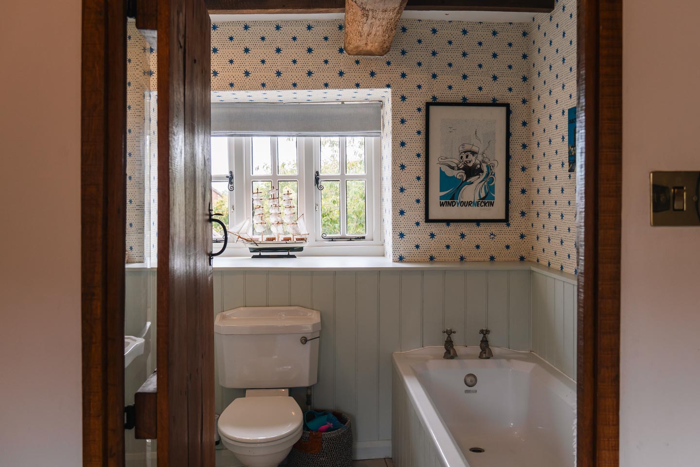 From here, to the front of the house, a panelled sitting room offers another inviting retreat, with its own Inglenook fireplace housing a wood-burning stove and beautiful cabinetry. There is also secret store behind the wood panelled wall!