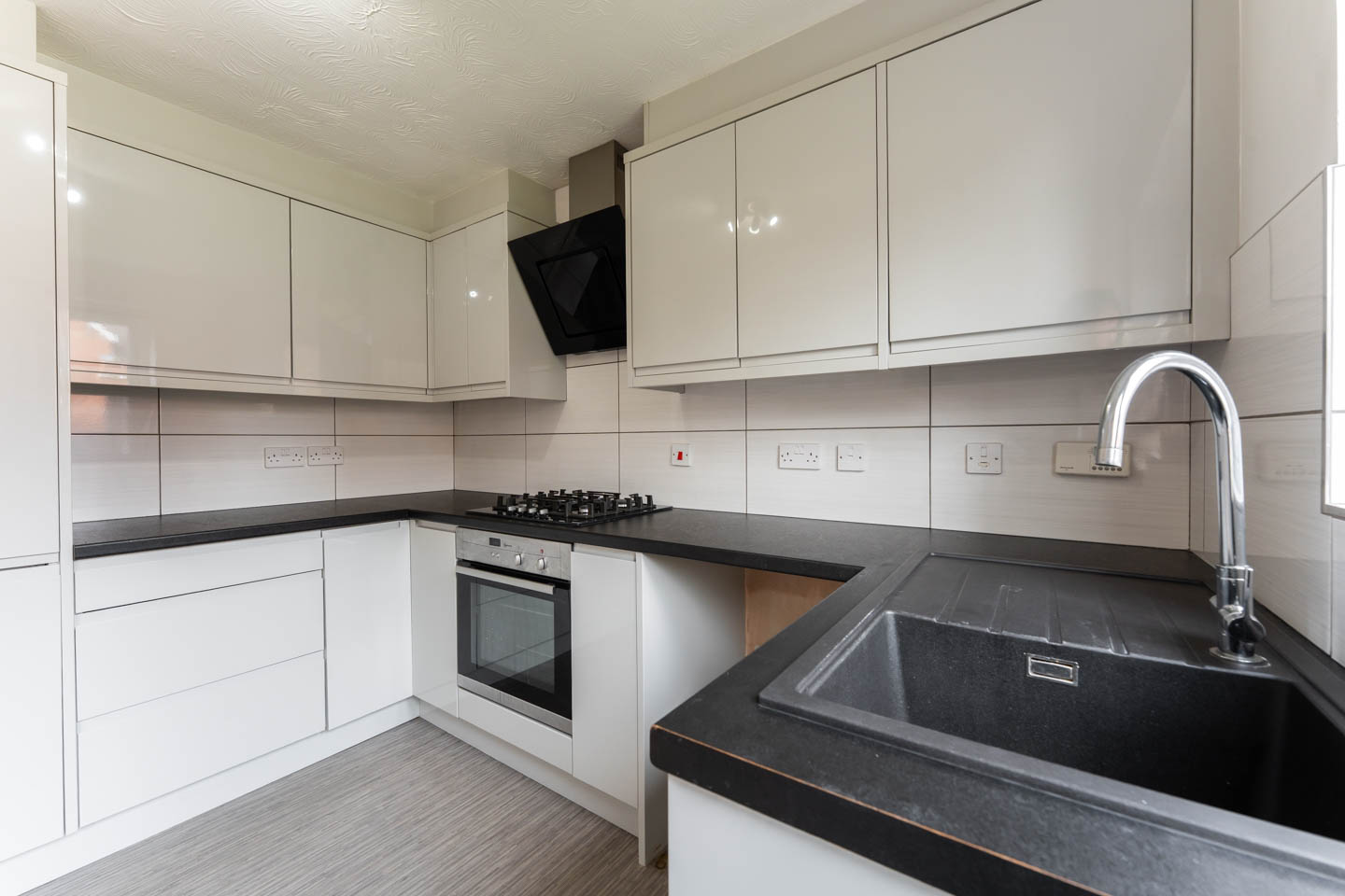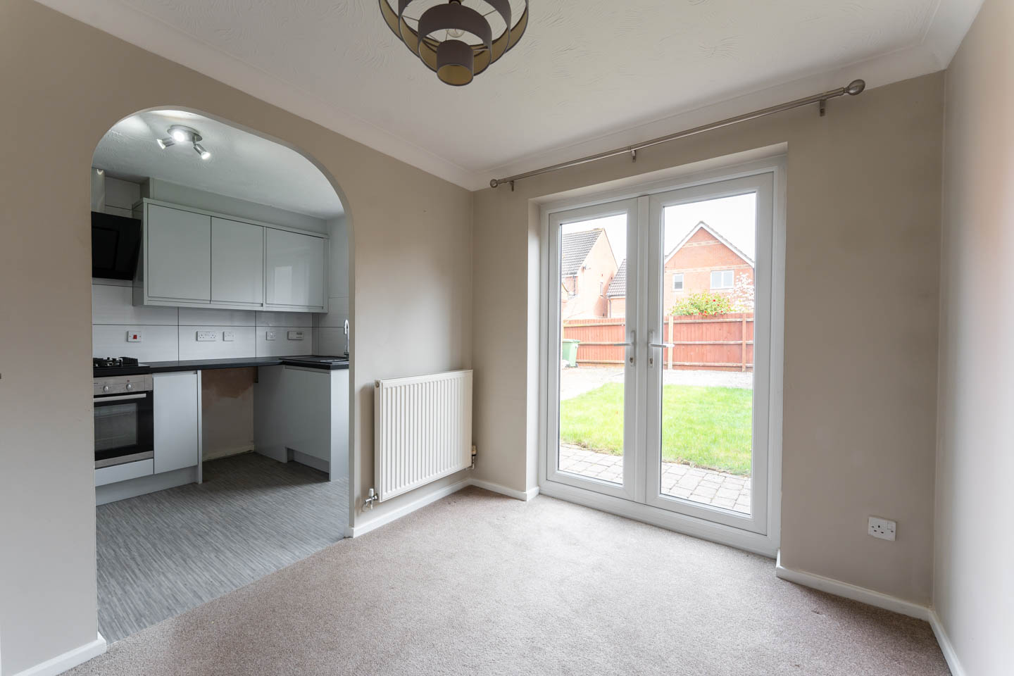 You enter via a covered storm porch, into a welcoming entrance hall, with stairs rising to the first floor and a door into the lounge. This is a generous front-facing reception room with a fitted electric fire and useful under-stairs storage. A door leads through to the dining room at the rear, a versatile second reception space with French doors that open directly onto the rear garden, ideal for entertaining inside and out. An archway connects through to the modern kitchen, which is fitted with a smart range of high gloss fronted base and wall units beneath worktops with tiled splash backs. Integrated appliances include an oven, four ring gas hob and a fridge-freezer, with space and plumbing provided for a washing machine. A door and window to the rear give direct garden access and plenty of natural light.