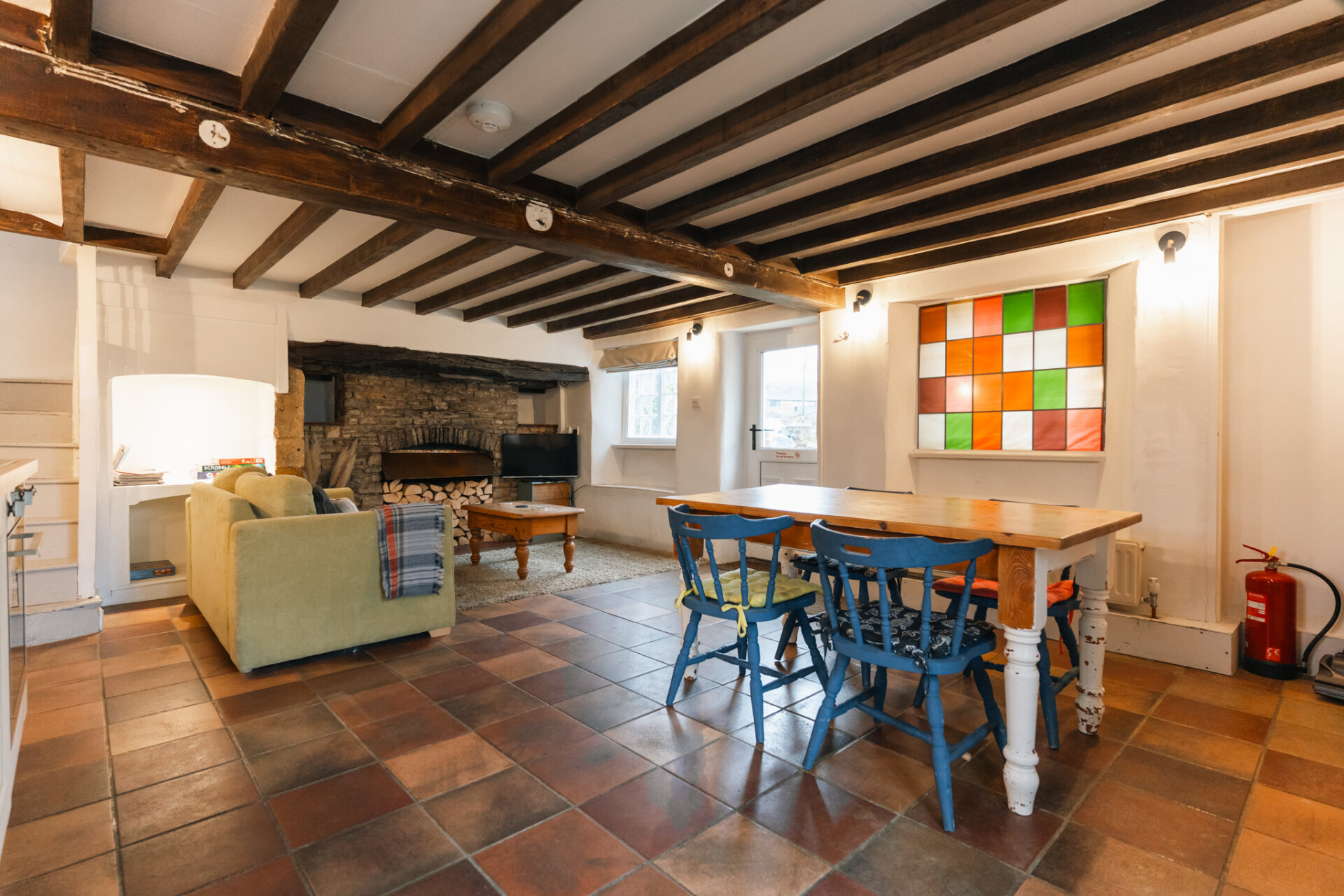 At the heart of the room sits a magnificent inglenook fireplace with substantial timber bressumer beam and brick surround. While not currently in use as part of the holiday let setup, the fireplace is operational and capable of returning to active use, offering the prospect of true fireside evenings.