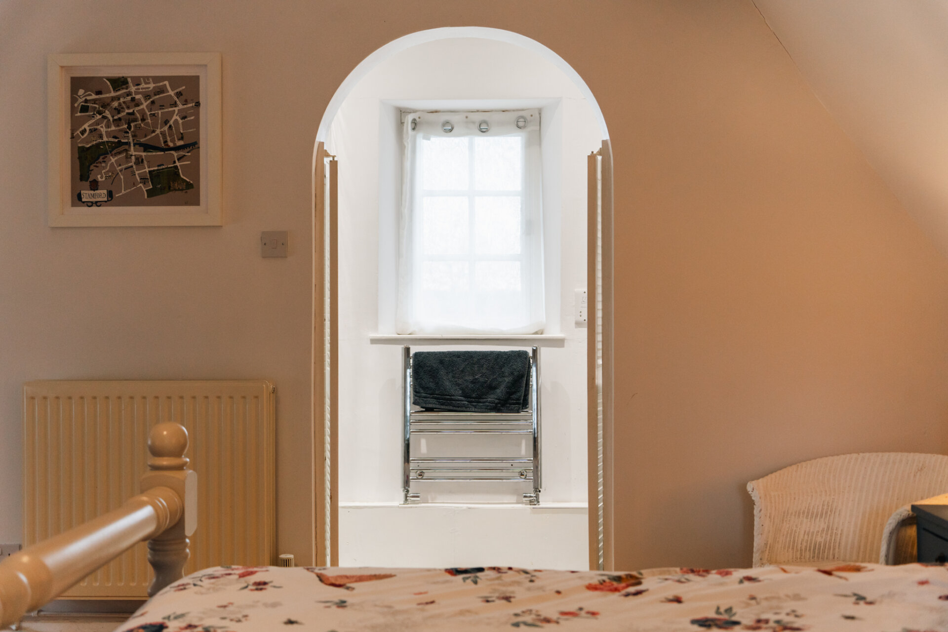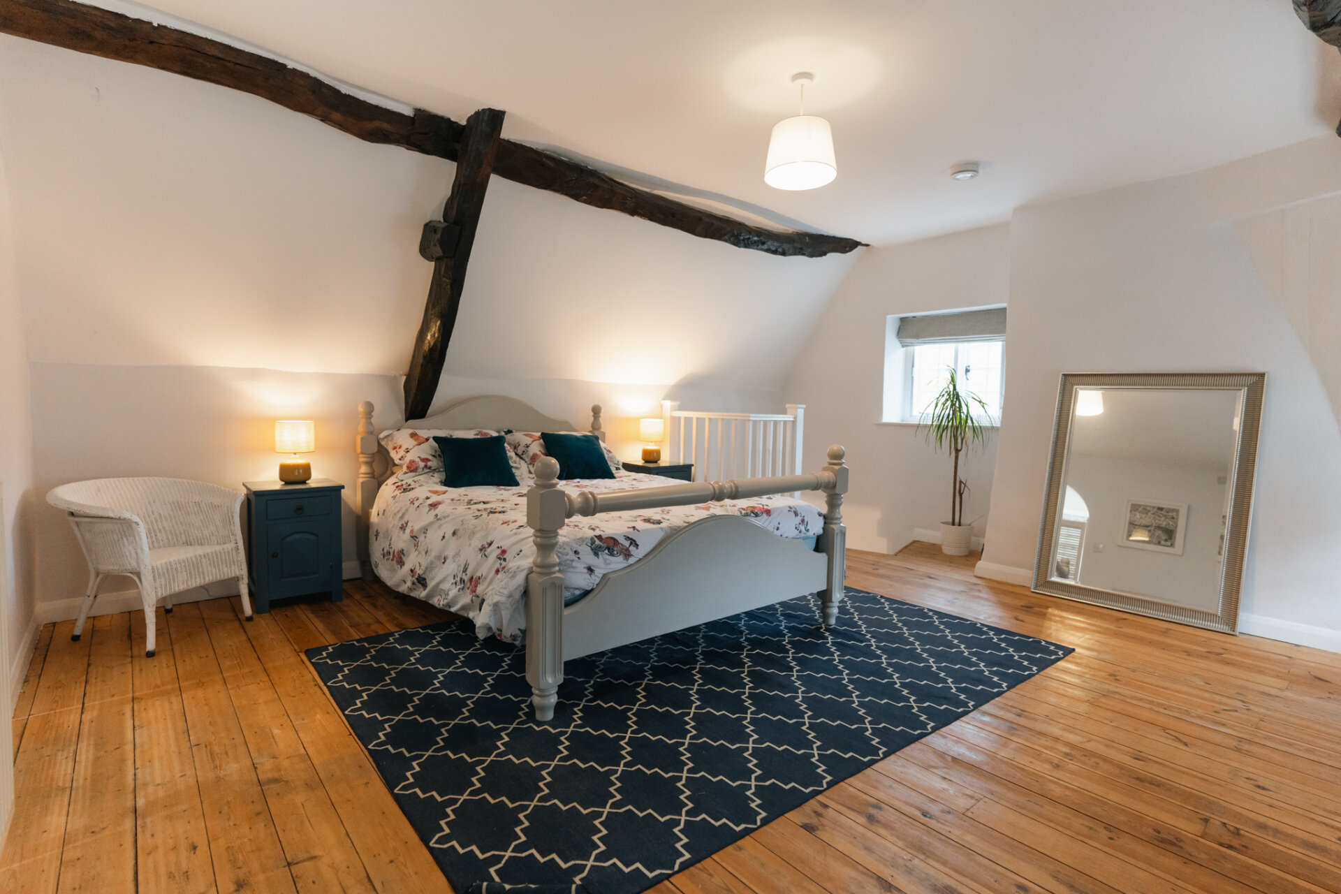 Exposed structural timbers create architectural interest while preserving a sense of openness. The room comfortably accommodates a double bed and additional furnishings, making it equally suited to everyday living or guest accommodation.