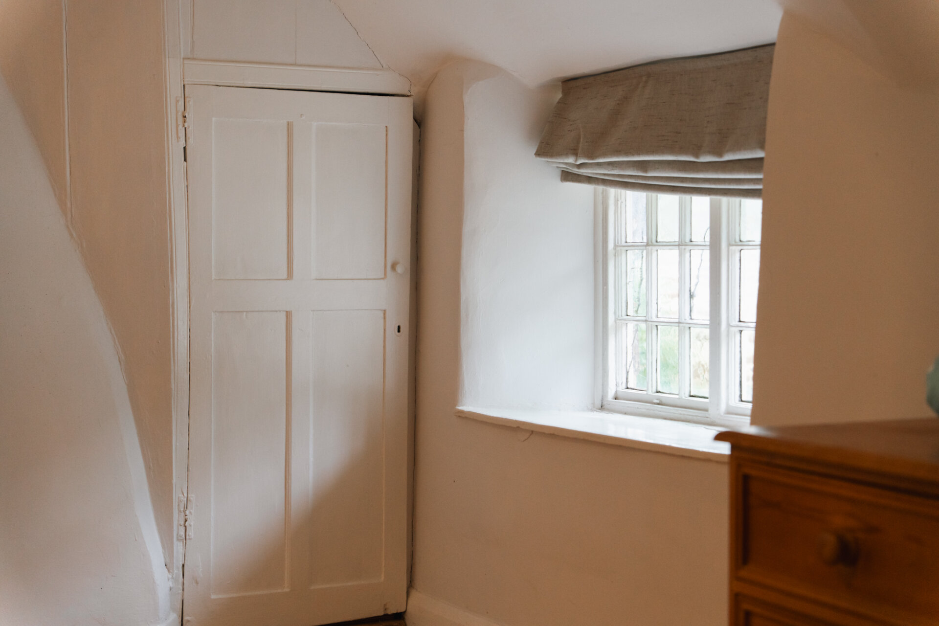 Exposed beams span the sitting room, adding depth and warmth, while the proportions feel cosy rather than confined. The occasional beam requires a gentle dip of the head — a small and charming reminder of the cottage’s age.