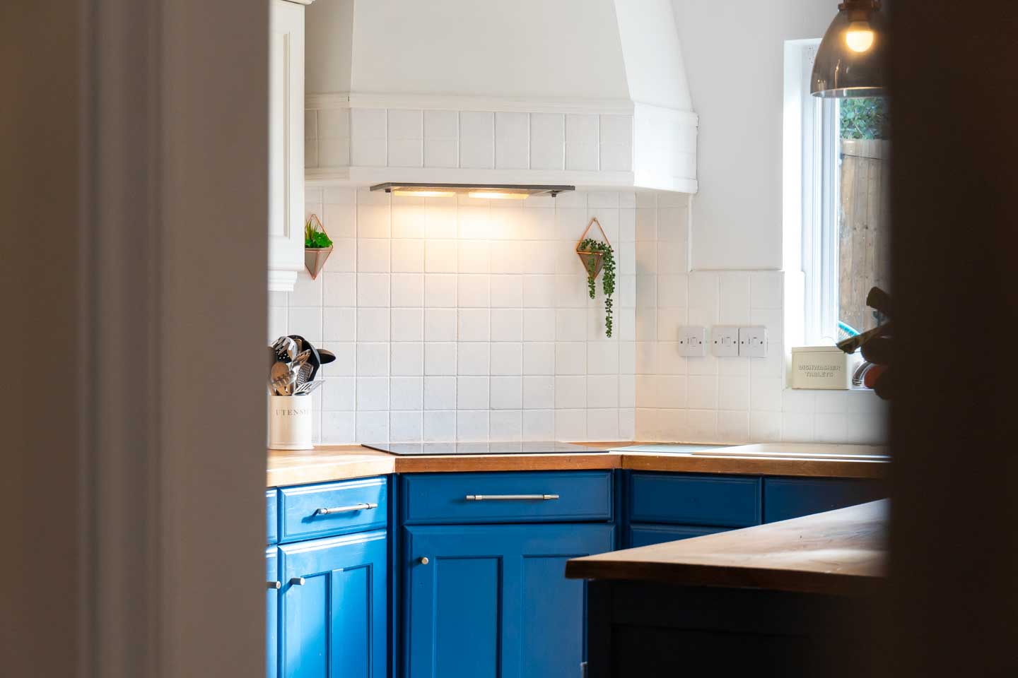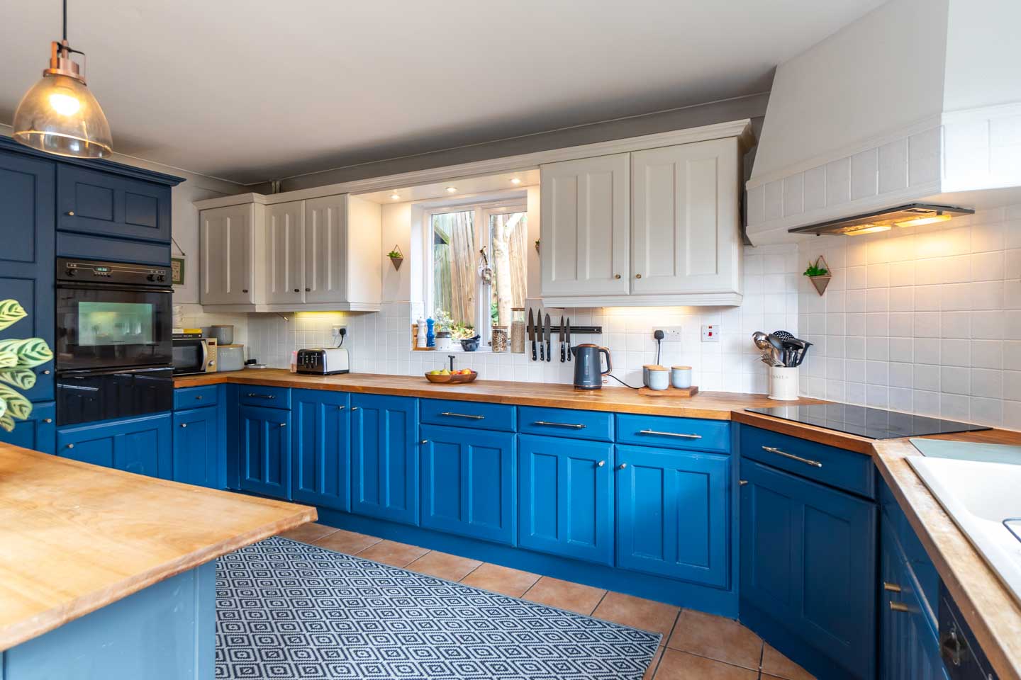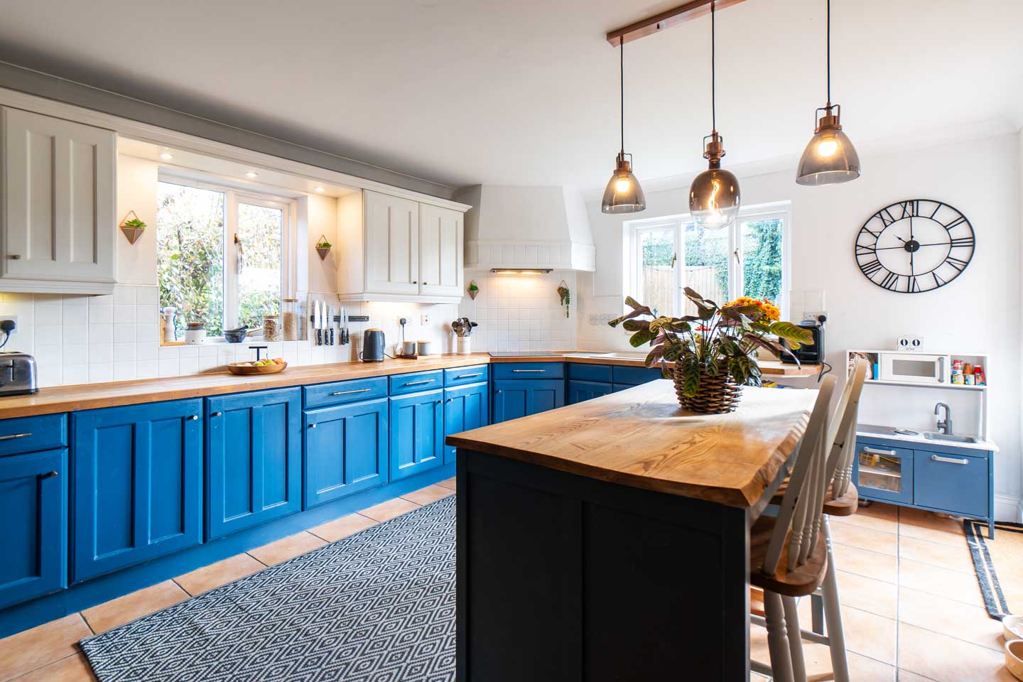 Positioned to the rear of the property is the spacious kitchen diner, which hosts a range of bespoke timber units and solid wooden worktop surfaces. There are built in appliances such as an electric oven, dishwasher and fridge freezer. The floor is tiled and there is ample room for a large dining table however the current owners fill this space with a breakfast bar style island. The room enjoys a triple aspect with French doors again opening out to the rear patio. From the kitchen you can find a very useful utility room which also provides access out to the side of the property.