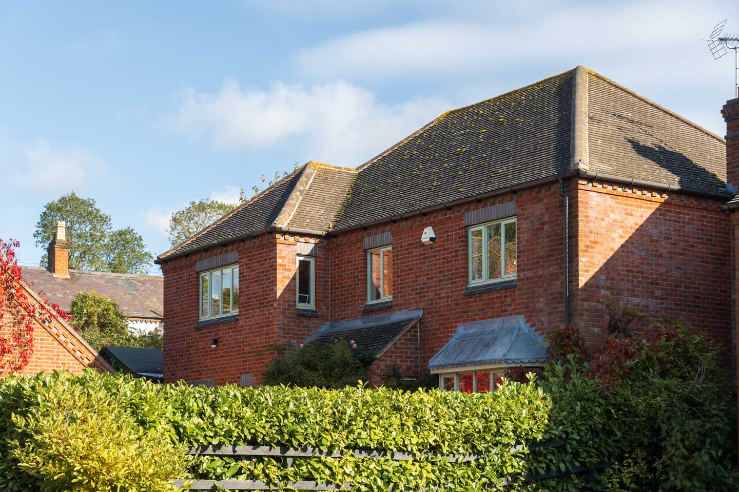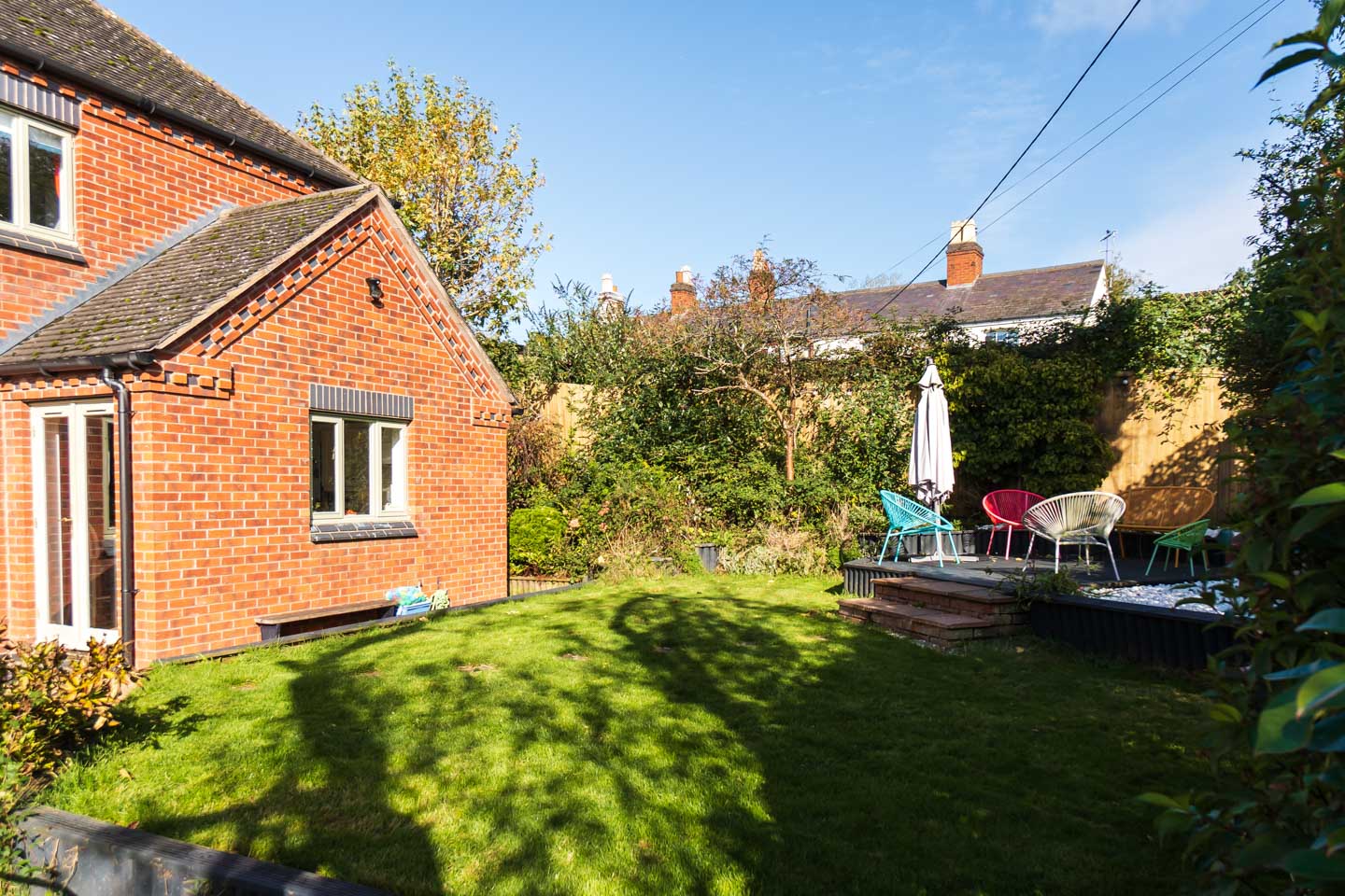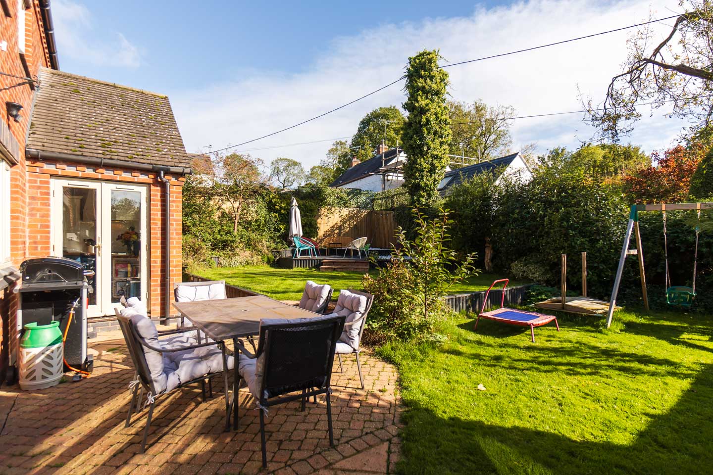 Moving outside, the main garden itself is of good size, slightly tiered to offer various seating areas with a lawn and well stocked mature borders. From one decked patio there is a lovely view down towards the village green. The gardens wrap around from the left of the property between the garage and house, and this space at the side is wide itself, with further shrubbery, sheds and an impressive timber garden room with its own lighting and power which would make a great hobby space or even a bar!