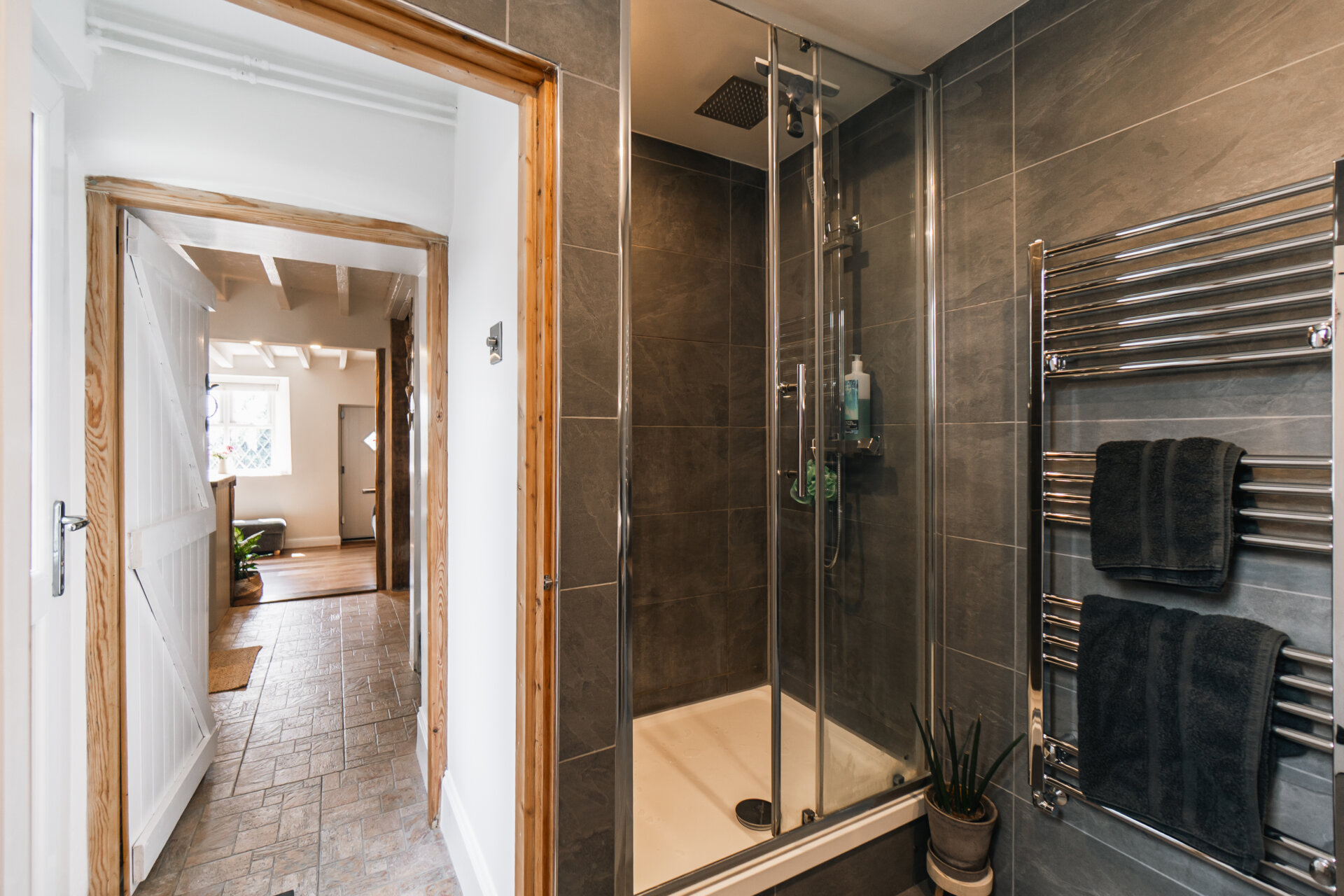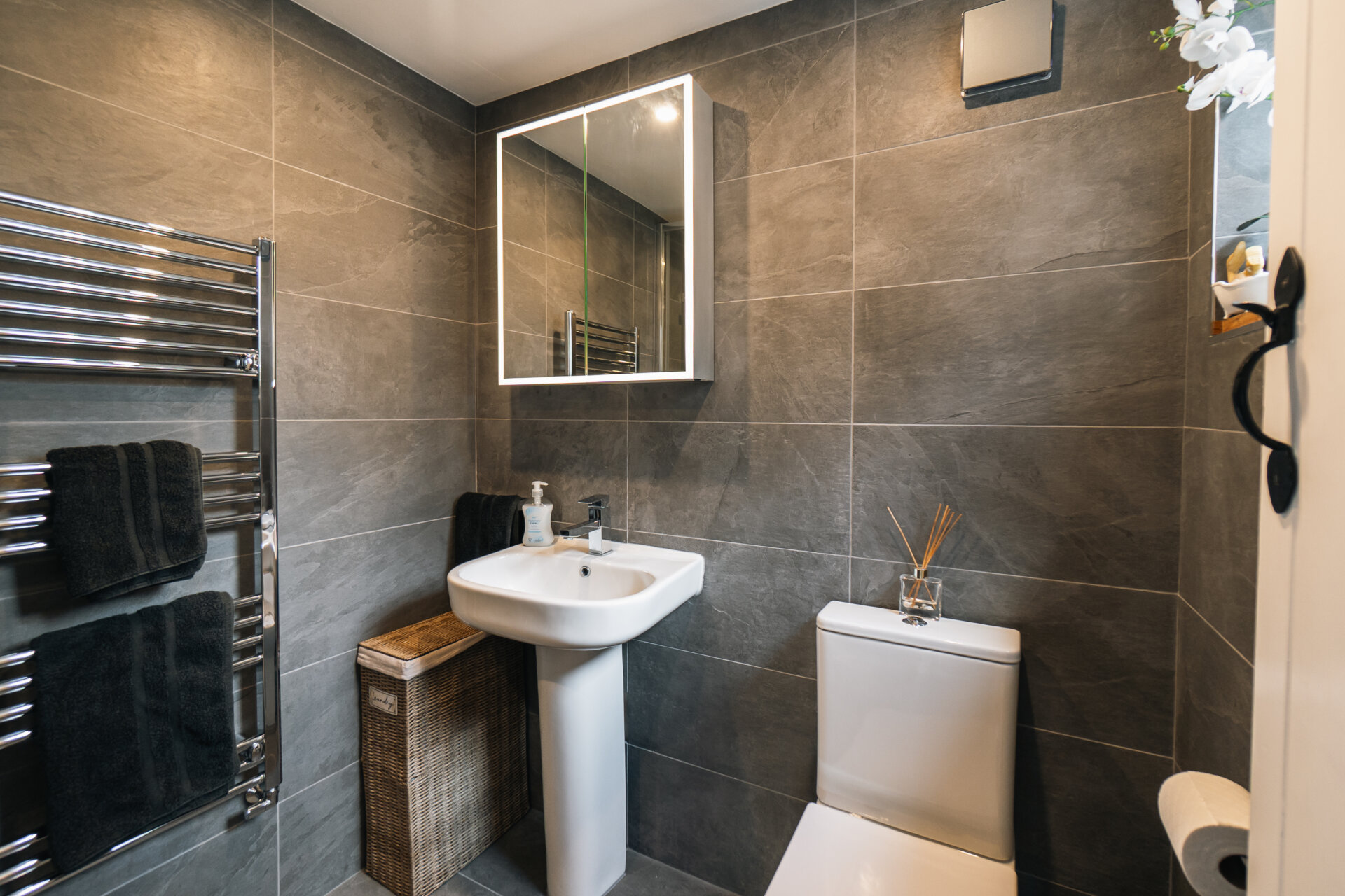 Bathroom - The bathroom is a sleek, modern 3-piece suite featuring a spacious shower area equipped with two showerheads, including a luxurious waterfall option. Contemporary grey tiling sets a stylish tone, complemented by spotlights that provide bright, even illumination throughout the space. A fitted mirror with integrated LED lighting and storage adds both functionality and elegance. The vanity sink and WC are thoughtfully designed, while a chrome heated towel rail offers added comfort. Practicality is enhanced by a double-glazed window, ensuring natural light and energy efficiency in this well-appointed bathroom.