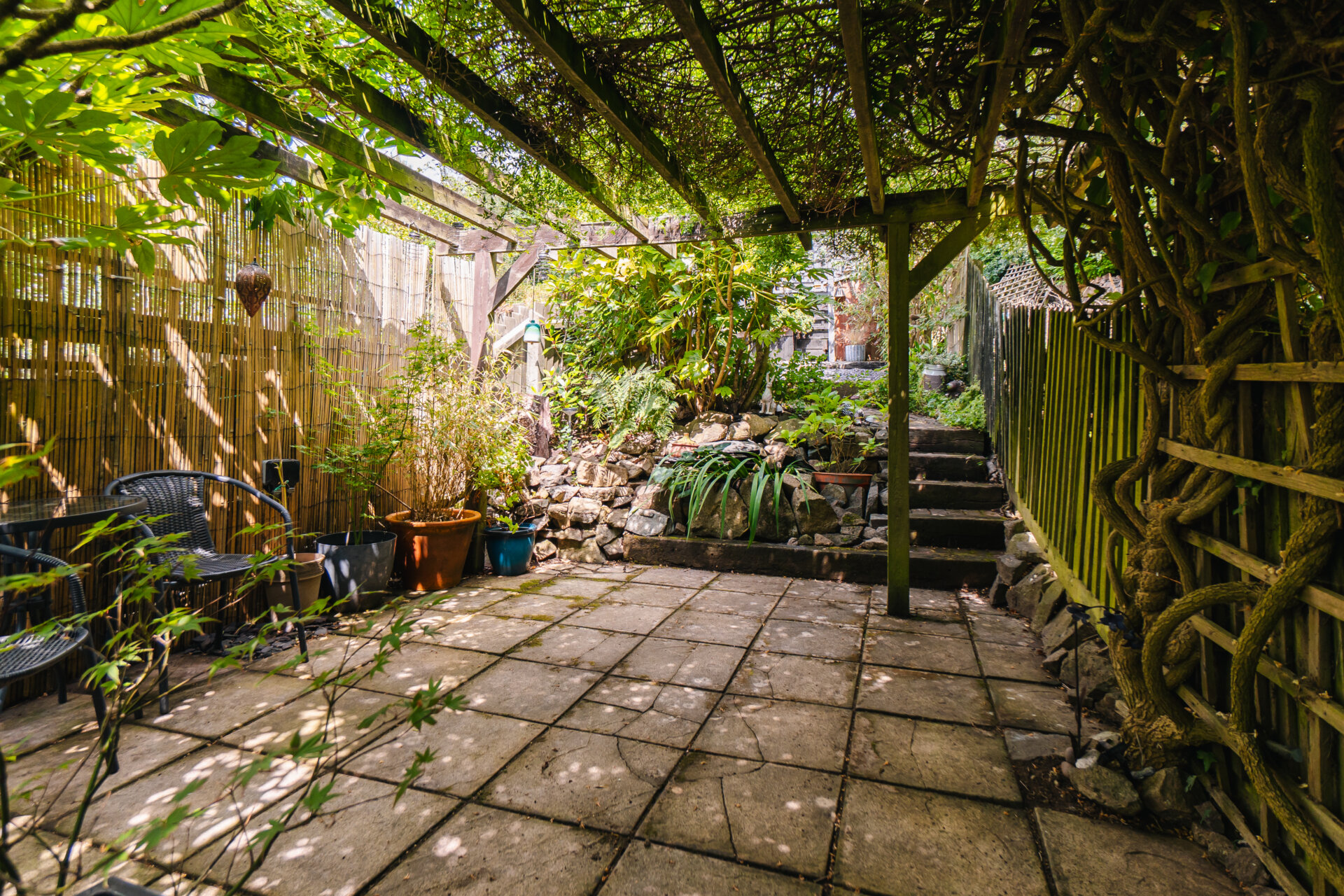 Garden - The garden is thoughtfully designed across multiple levels, beginning with a courtyard-style space featuring slabbed flooring, outdoor lighting, and enough room for bistro seating—perfect for intimate outdoor dining. Up the stairs, the next level showcases plum slate flooring bordered by mature trees and hedges, complemented by beautiful rockeries. At the top, a large seating area sits beneath a pergola adorned with a natural jasmine canopy, finished with a tranquil water feature cascading over the rockeries. The third level offers a raised, decked seating area with stunning countryside views, ideal for entertaining or enjoying a quiet coffee. Beyond this sits a versatile summer house, adaptable as a bar, small gym, or additional storage. Finally, the garden concludes with a charming wildflower area, adding a natural, vibrant touch to the outdoor space.
