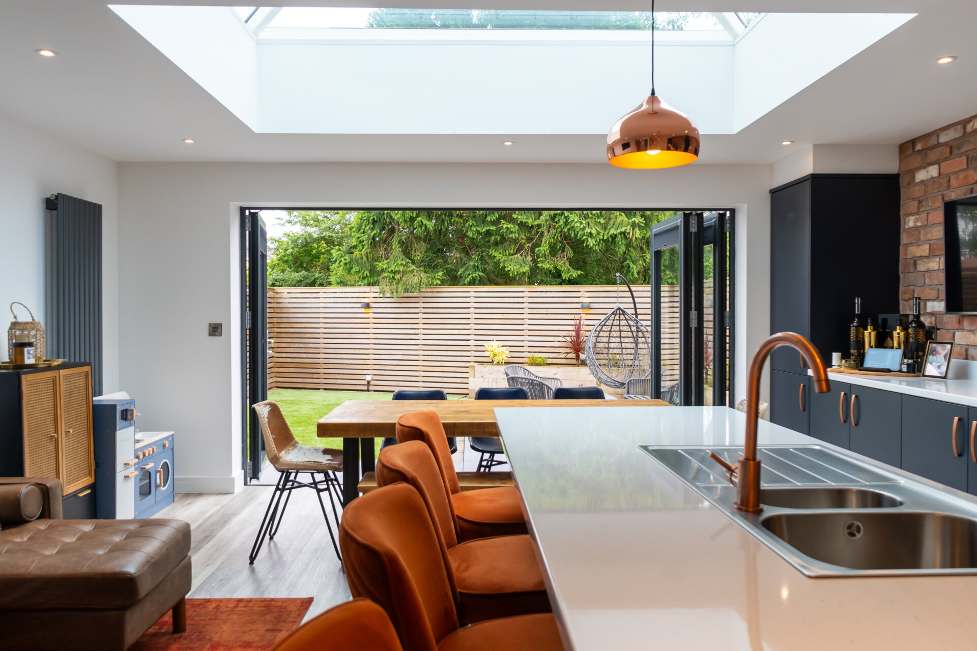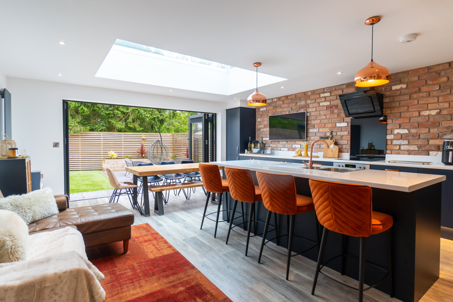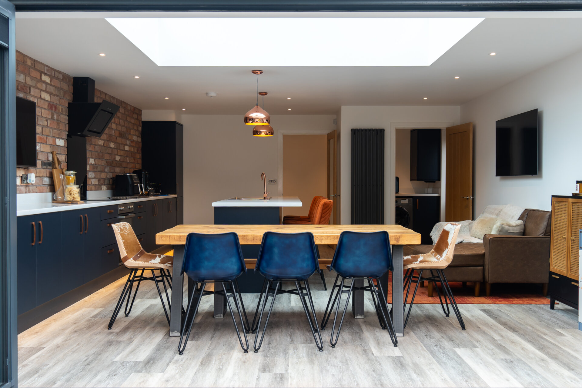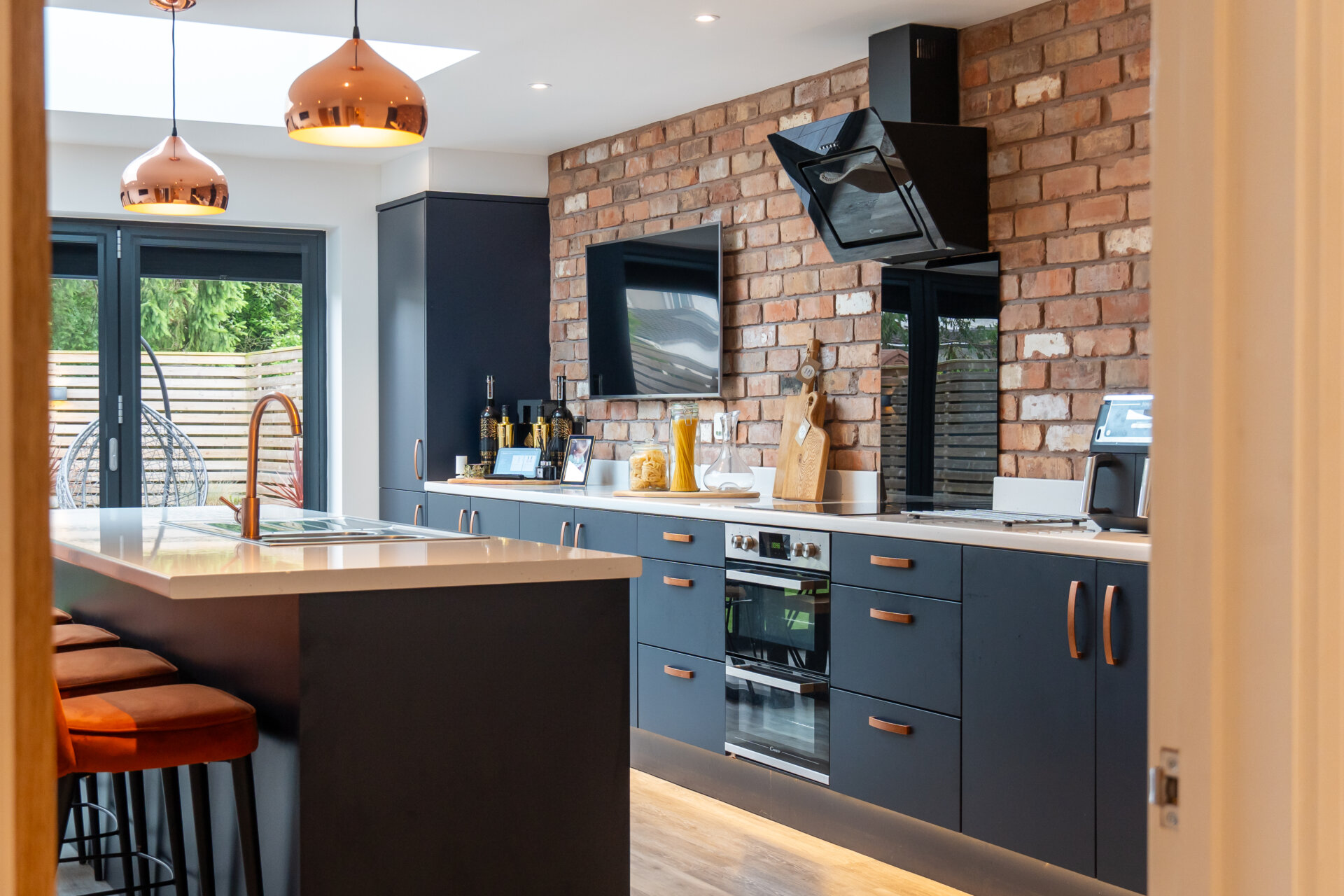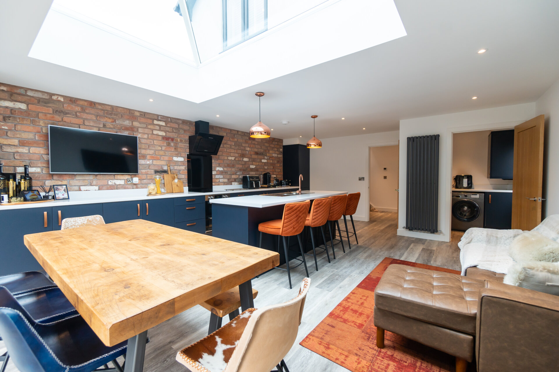 Kitchen-Diner - A stunning open-plan kitchen-diner that effortlessly combines modern elegance with cozy comfort. The heart of this space is the beautiful kitchen featuring sleek navy blue cabinets, complemented by copper handles and accents. The kitchen island, equipped with a pristine white countertop, provides ample space for meal preparation and casual dining, with four stylish orange bar stools adding a pop of colour. Exposed brick walls add character and warmth, perfectly paired with the contemporary pendant lighting hanging above the island. It is a perfect blend of functionality and style, making it an ideal space for both daily living and hosting memorable gatherings.