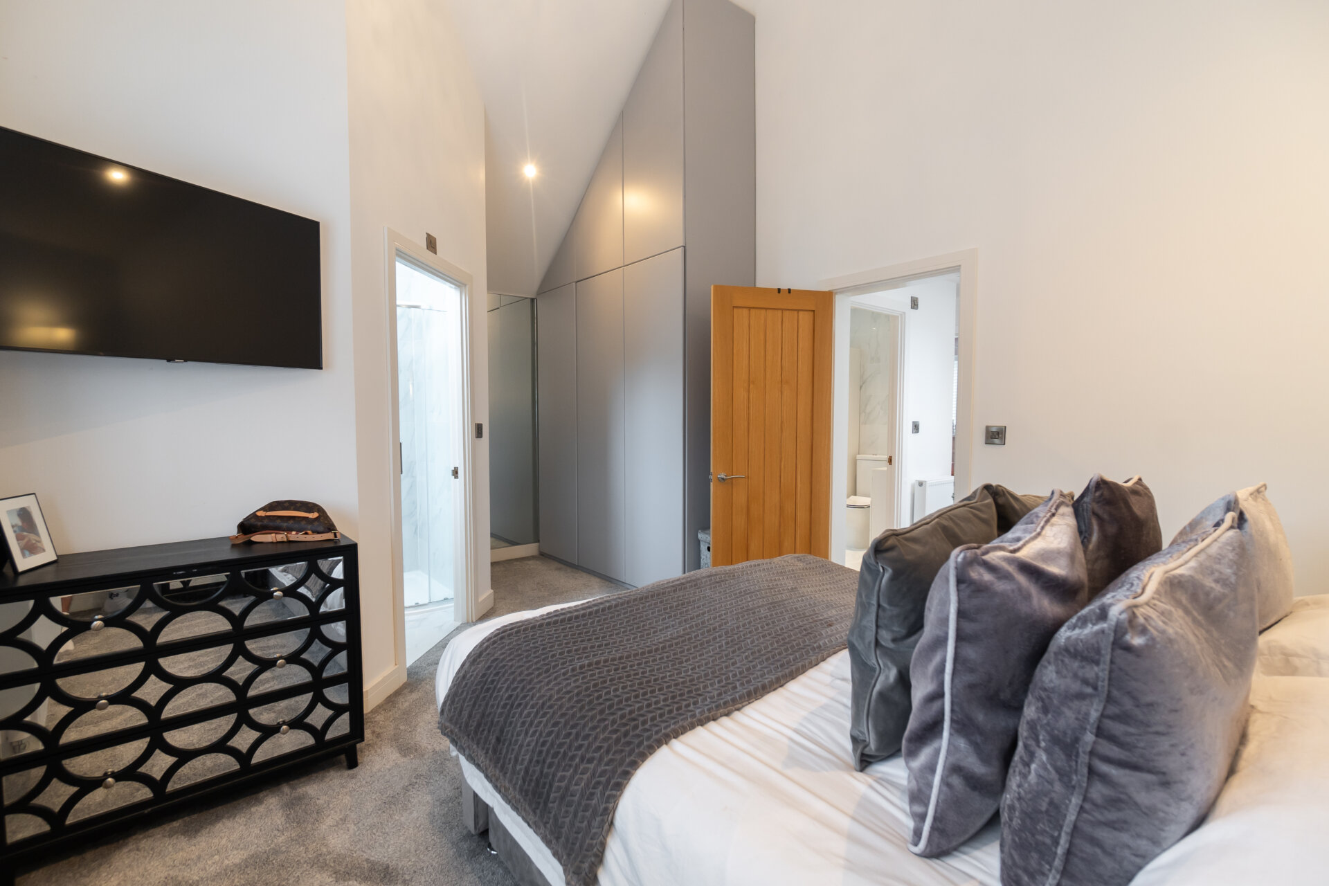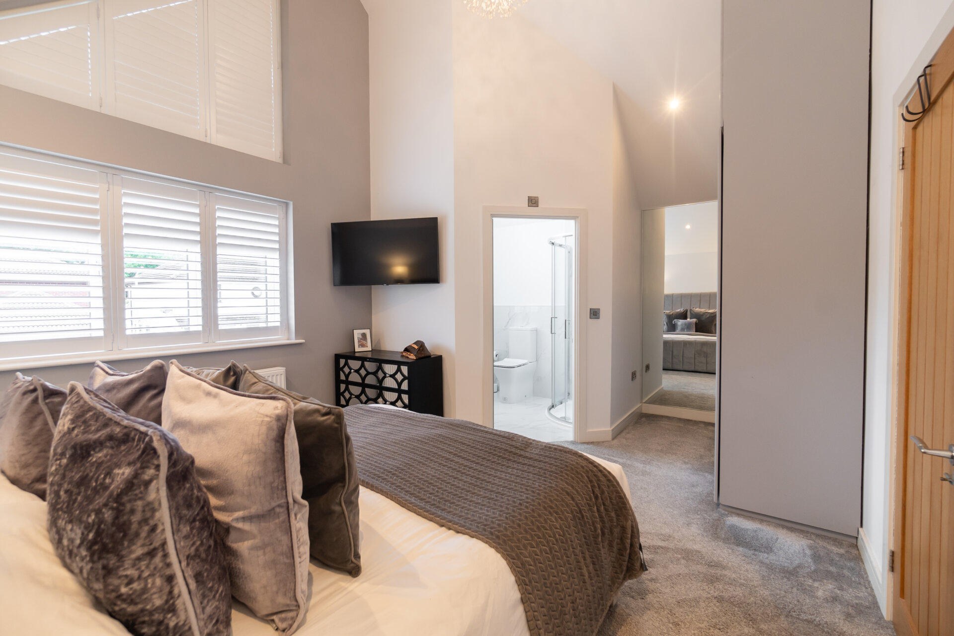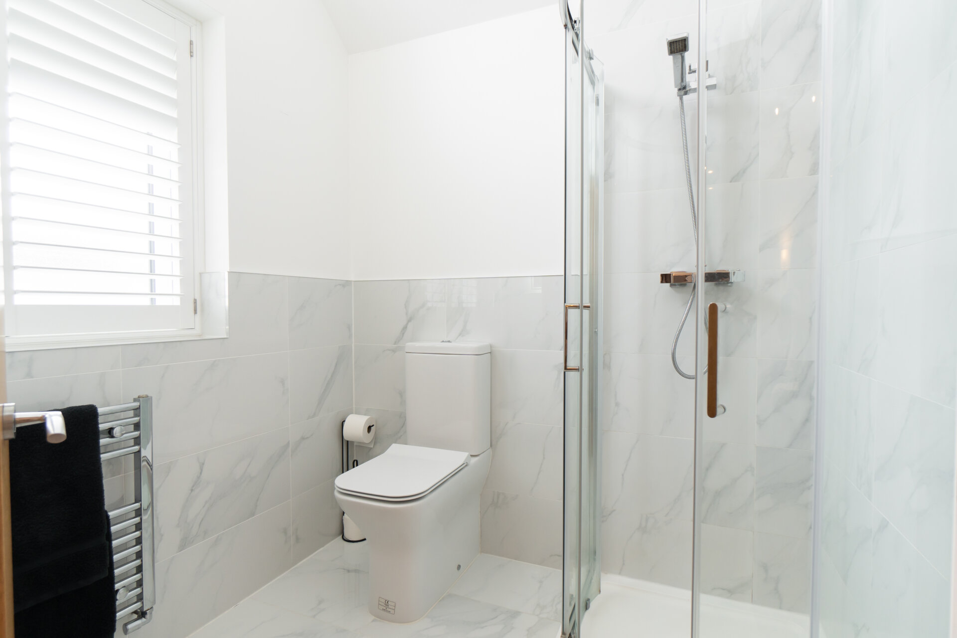 En-Suite - Modern monochrome style En-Suite to the master with a large corner shower, toilet and sink fitted. It also benefits from having a chrome heated ladder rail.