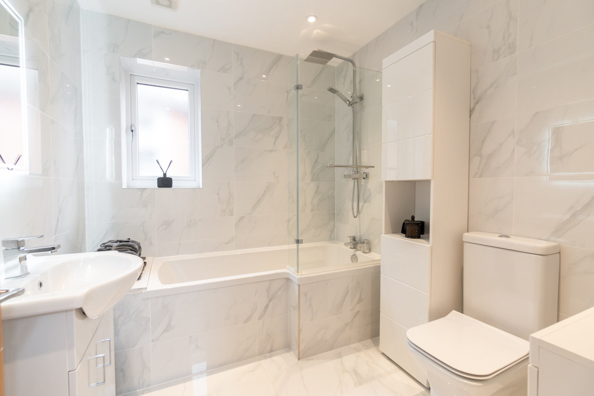 Bathroom - To the centre of the home is a luxurious and impeccably designed bathroom. The elegant marble-effect tiles provide a timeless aesthetic, while the contemporary fixtures and fittings offer a touch of modernity. Enjoy the convenience of a full bath with a shower, ample storage space, and a bright, inviting atmosphere. There is also a a sleek vanity unit and toilet.