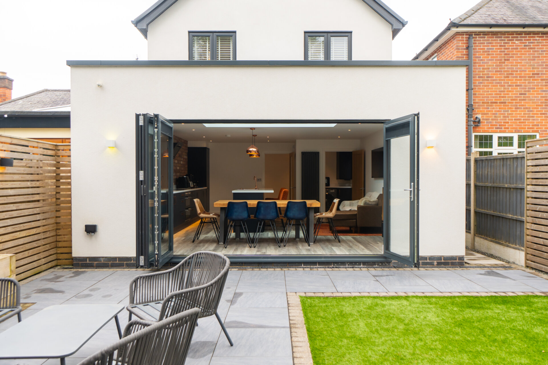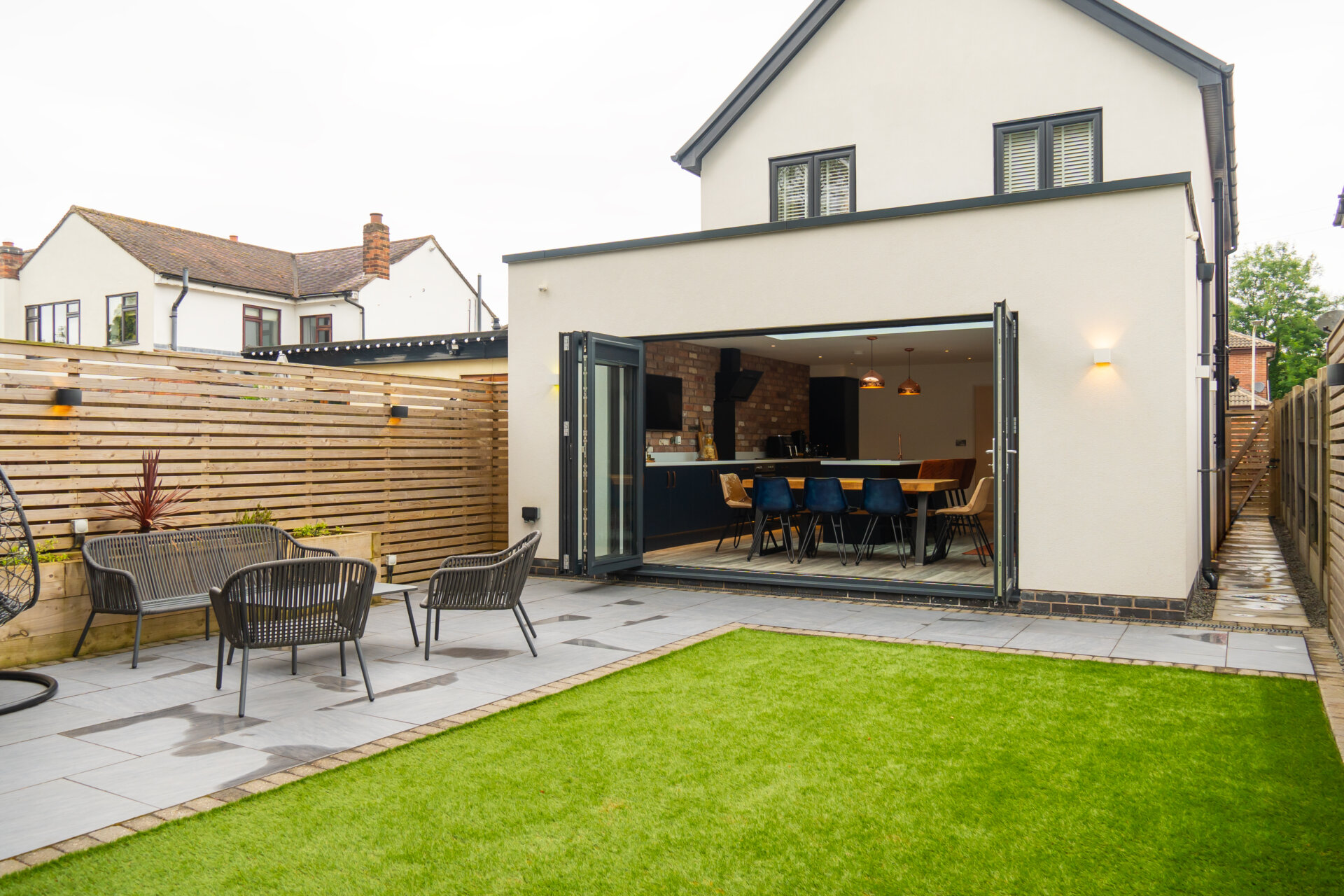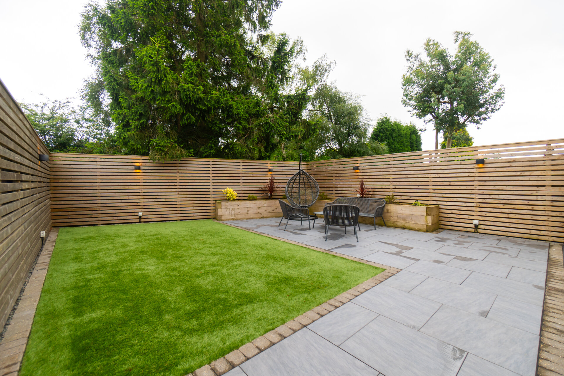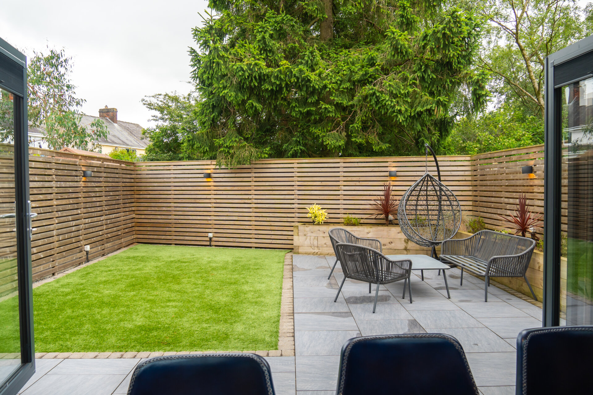 Exterior Rear - Modern and low maintenance garden to the rear, with large patio area to one side and a artificial lawn to the other. There is also planets to one side and the benefit of outdoor sockets.