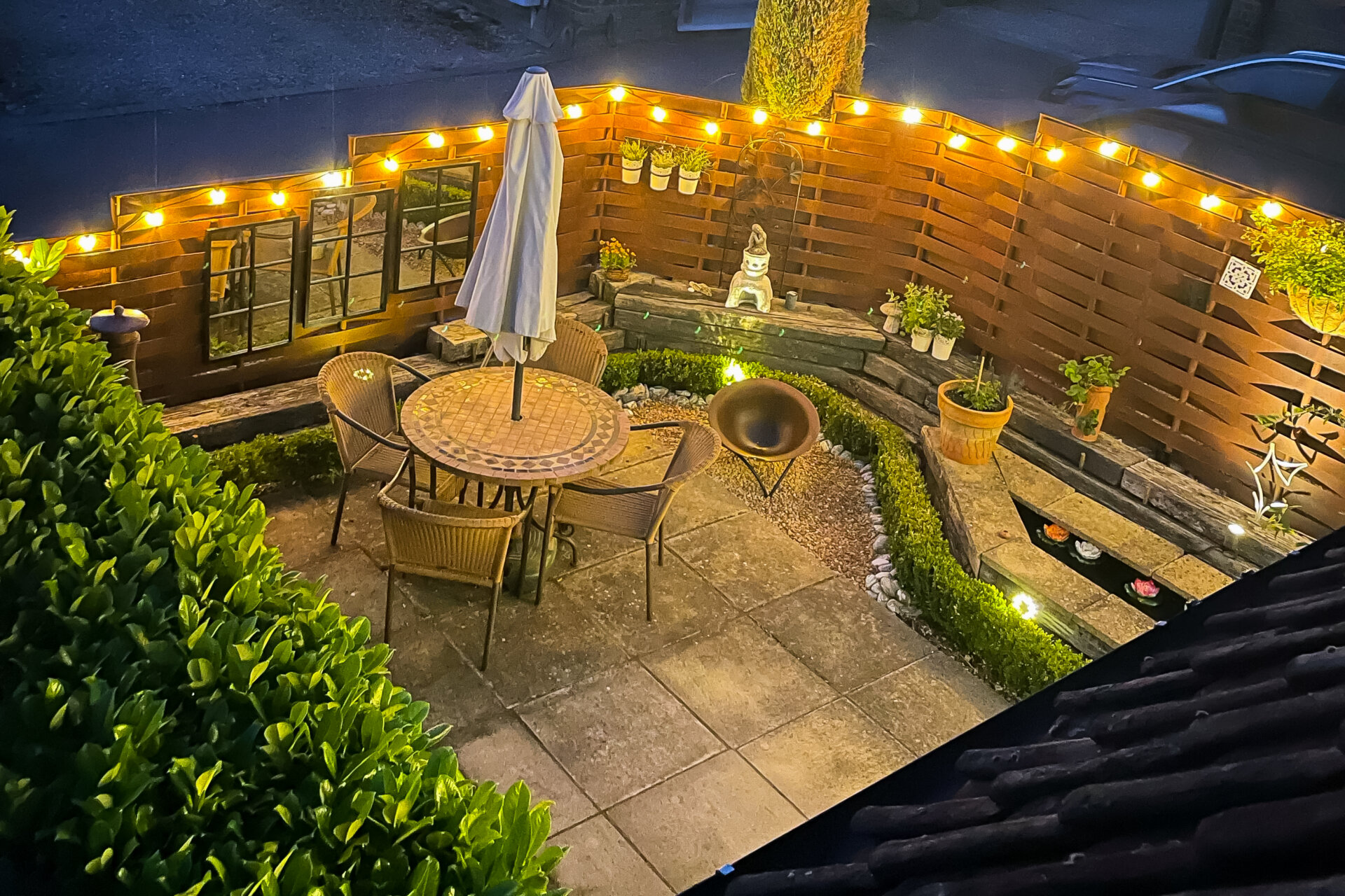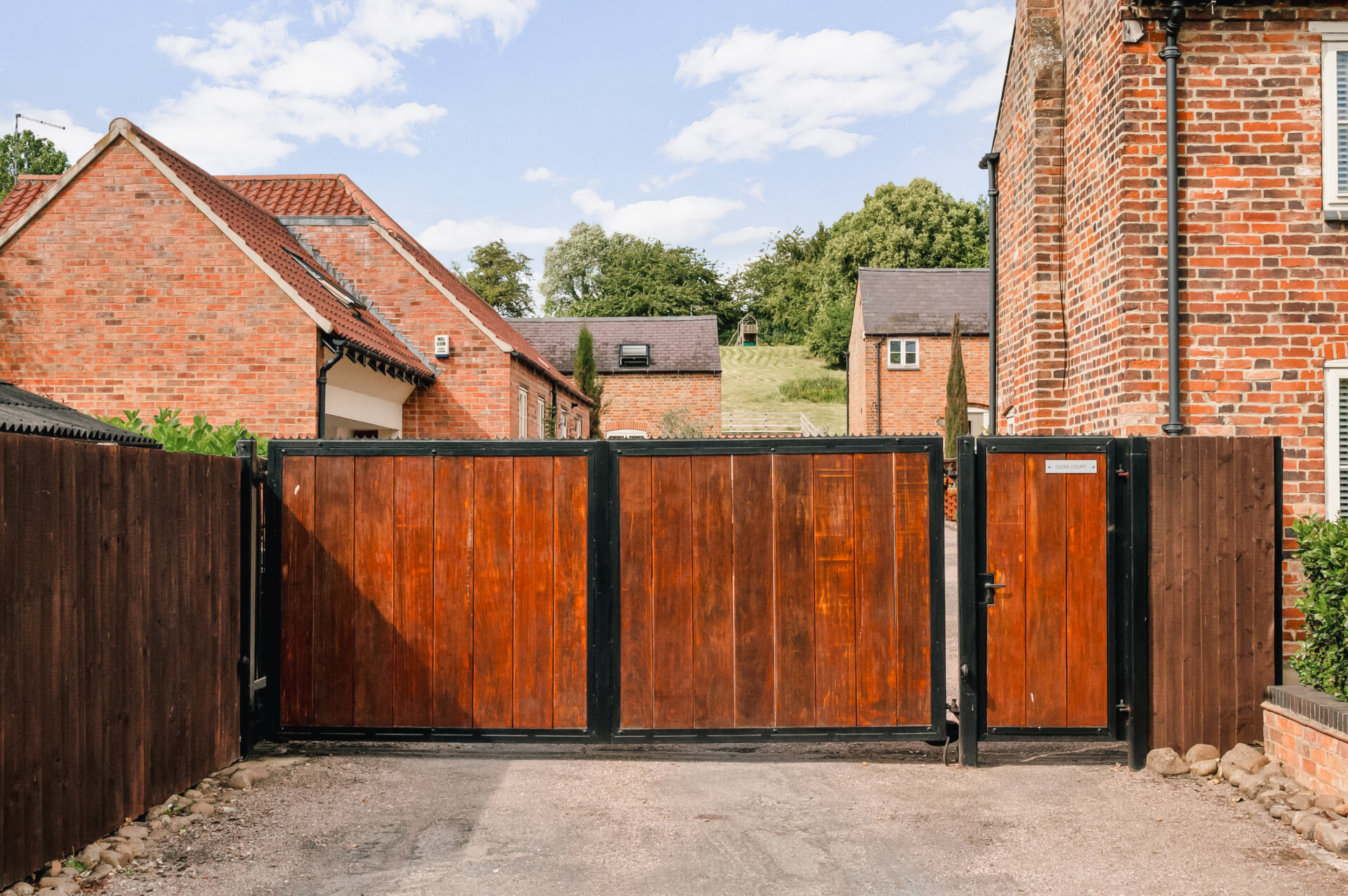 Outside, electric wooden gates open into the development, leading to a gravelled frontage with parking for multiple vehicles. The private courtyard garden is designed for low maintenance and privacy, with patio seating, mature hedging and a contemporary water feature, creating a calm and attractive outdoor space.