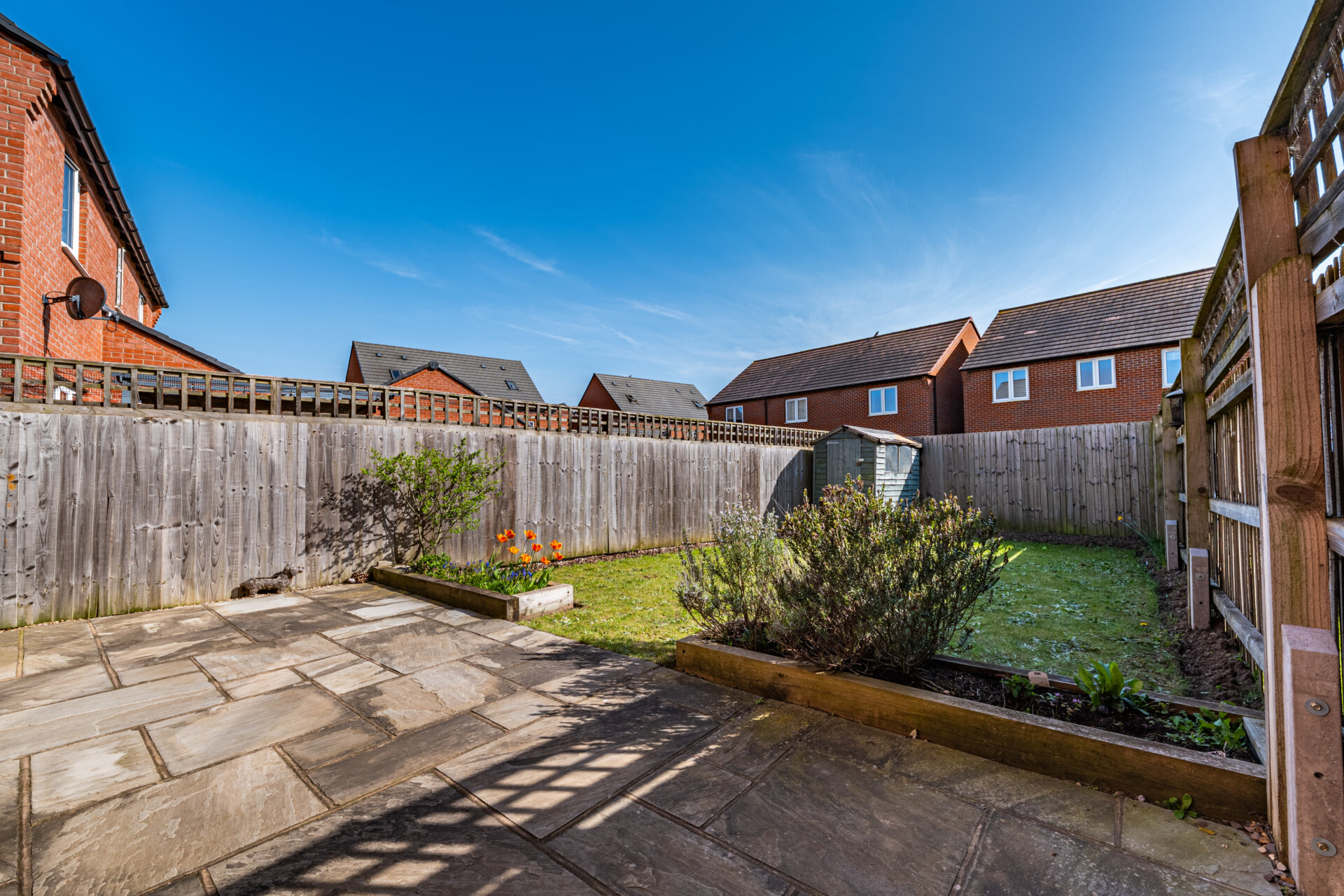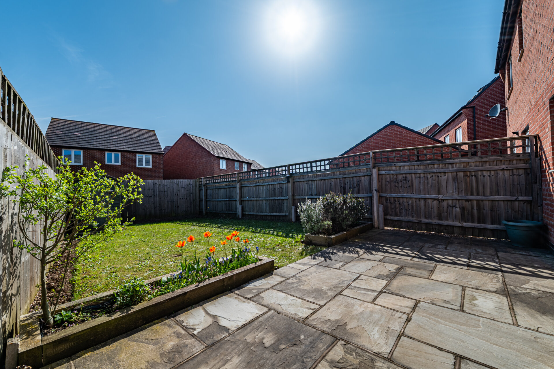 The rear garden has a beautifully landscaped, south-facing orientation and has been designed with both relaxation and play in mind. Predominantly laid to lawn, it is edged by a recently installed patio terrace, offering a natural setting for outdoor dining in the warmer months. The space is enclosed, lending a sense of privacy and calm.