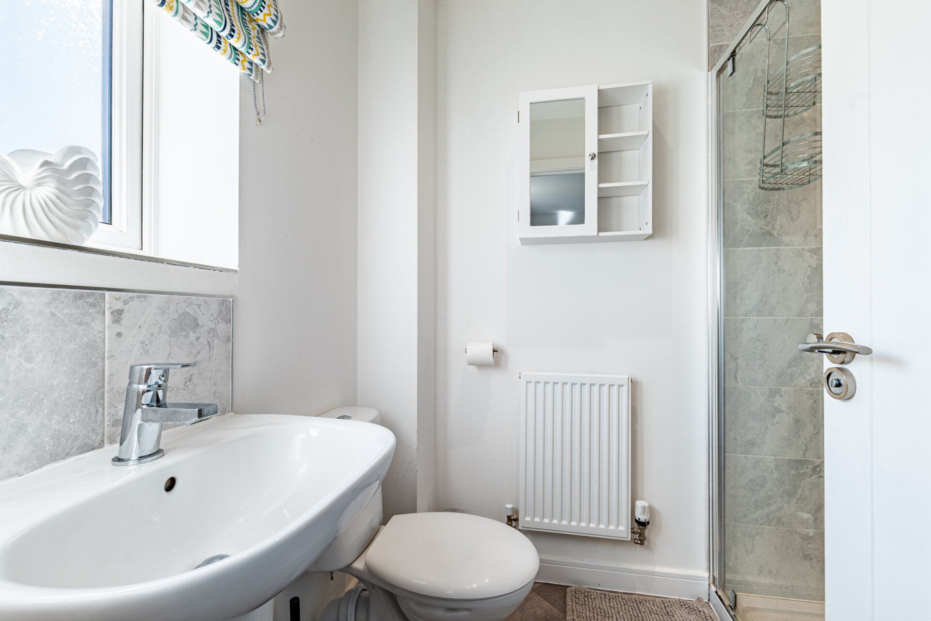 A deceptively spacious entrance hall introduces the ground floor, where spaces unfold with an easy sense of flow. To the front, a calm and proportioned sitting room offers a place of retreat, while to the rear, the home opens into a light-filled kitchen and dining room. Finished in a muted grey palette with high-gloss cabinetry, the kitchen is both practical and refined, with integrated appliances subtly concealed. Wide glazed doors draw in natural light and extend the living space outward, creating a seamless connection to the garden beyond. Upstairs, three well-proportioned bedrooms are arranged around a central landing. The principal bedroom is quietly positioned and includes built-in wardrobes and a neatly detailed three-piece en suite shower room. A family bathroom serves the remaining rooms, continuing the home’s understated, contemporary aesthetic.