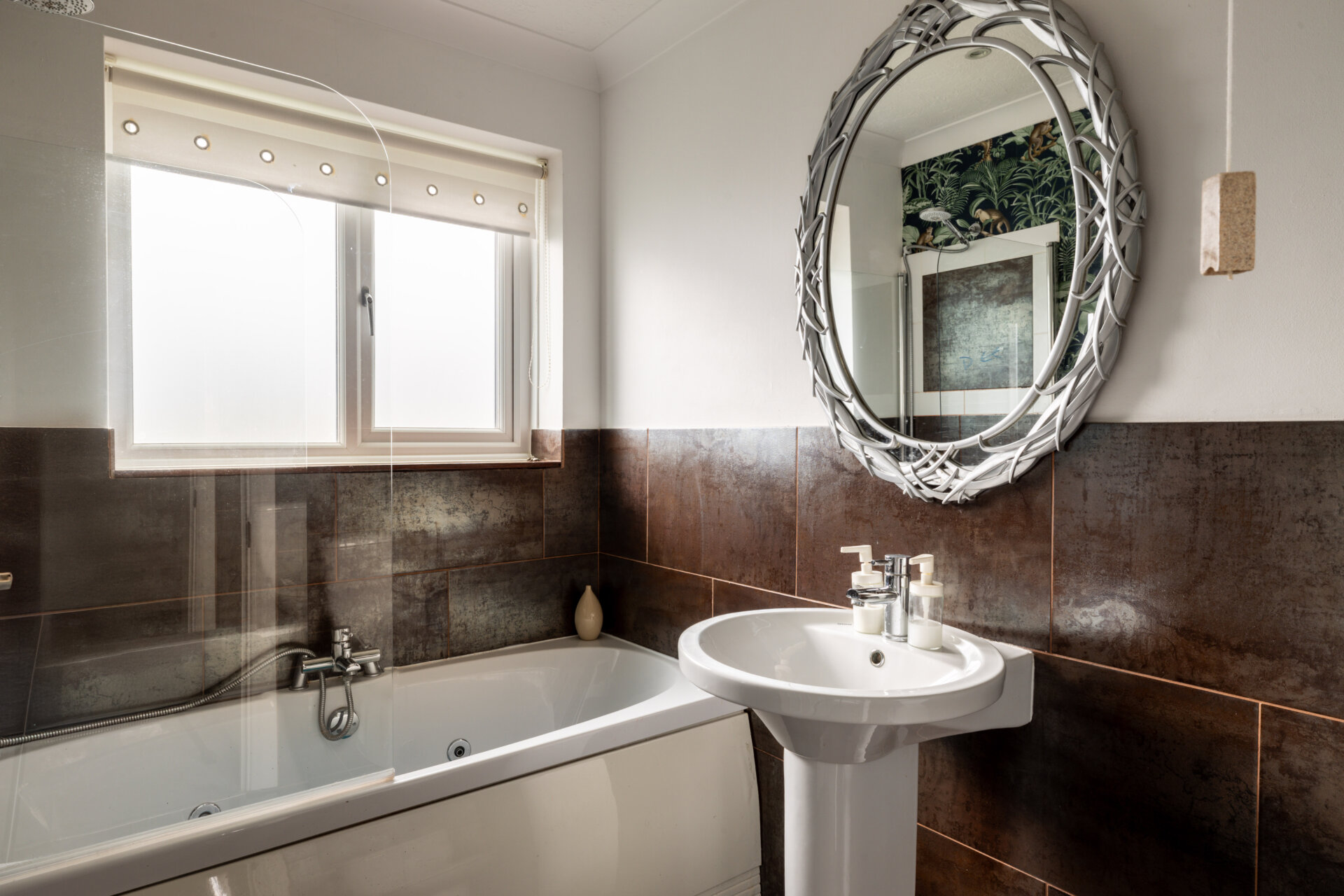 The family bathroom is bright and well-proportioned, featuring both a bath and a shower.