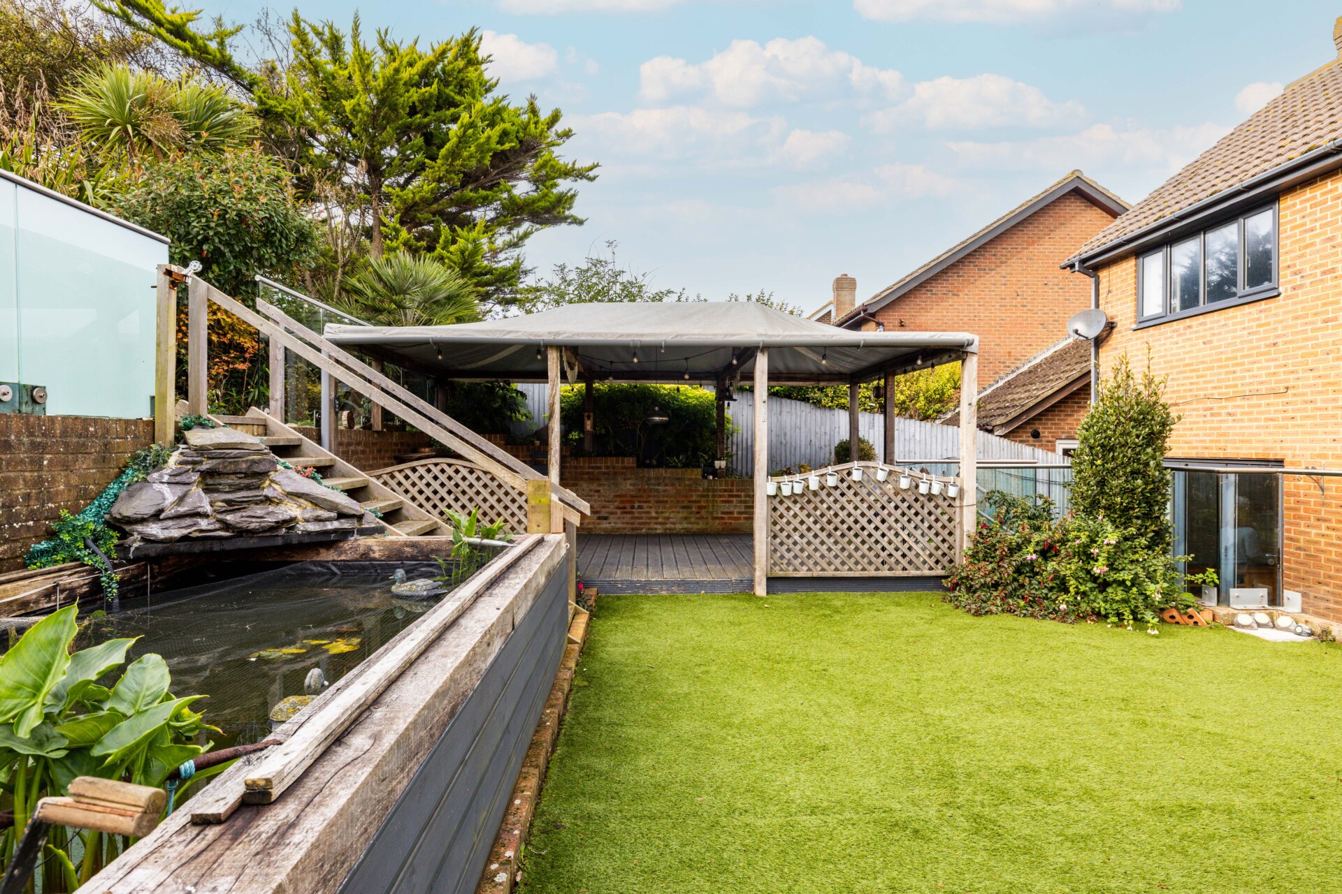 A decked seating area sits beneath a charming pergola, the perfect spot for al fresco dining, summer entertaining, or simply relaxing with a glass of wine as the sun sets.