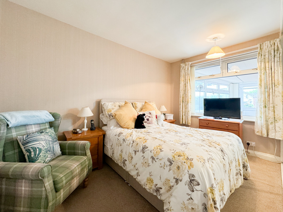 The bedroom is of excellent size, with built in wardrobes and views through the garden room.