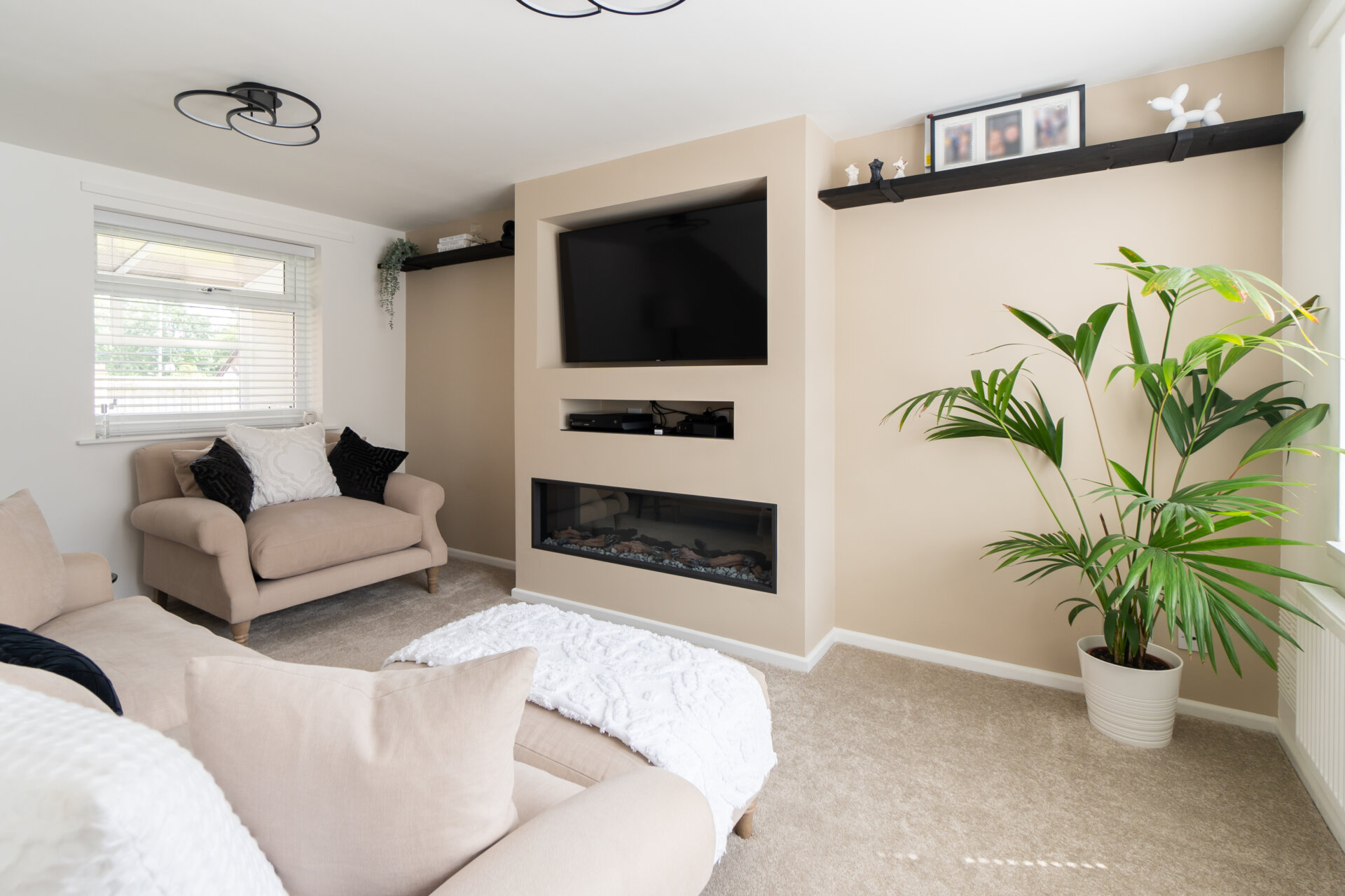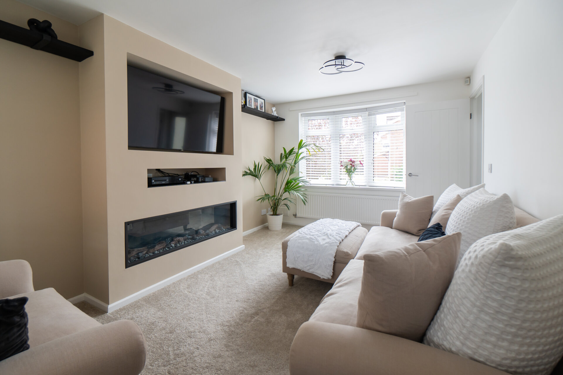 Media wall with electric fire, x2 radiators, UPVC double glazed window to the front and rear elevation