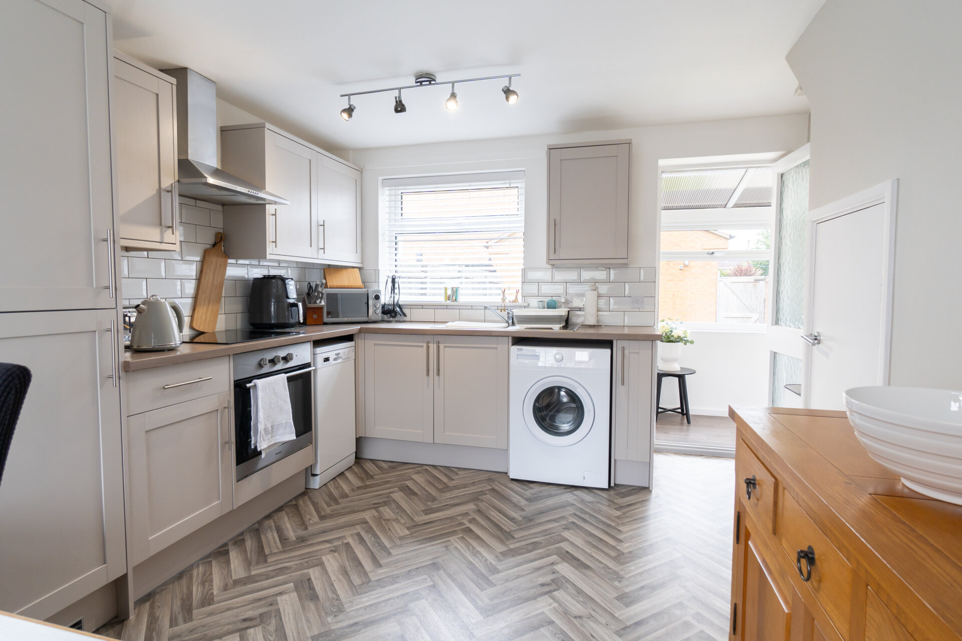 Wall, base and drawer units with work surface over, stainless steel sink & drainer unit with mixer tap over, tiled walls and splash backs, built-in fridge/freezer, oven, electric hob and extractor hood over, space for a dishwasher and plumbing for automatic washing machine, UPVC double glazed window to the front and rear, radiator, door to understairs storage cupboard and door to
