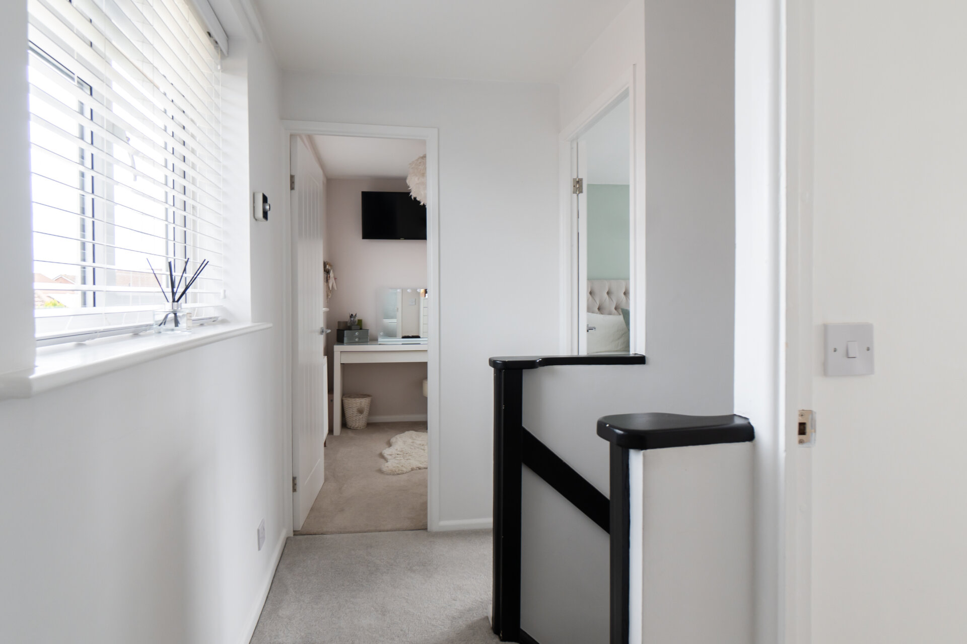 UPVC double glazed window to the front, radiator and built-in wardrobe over the stairs.