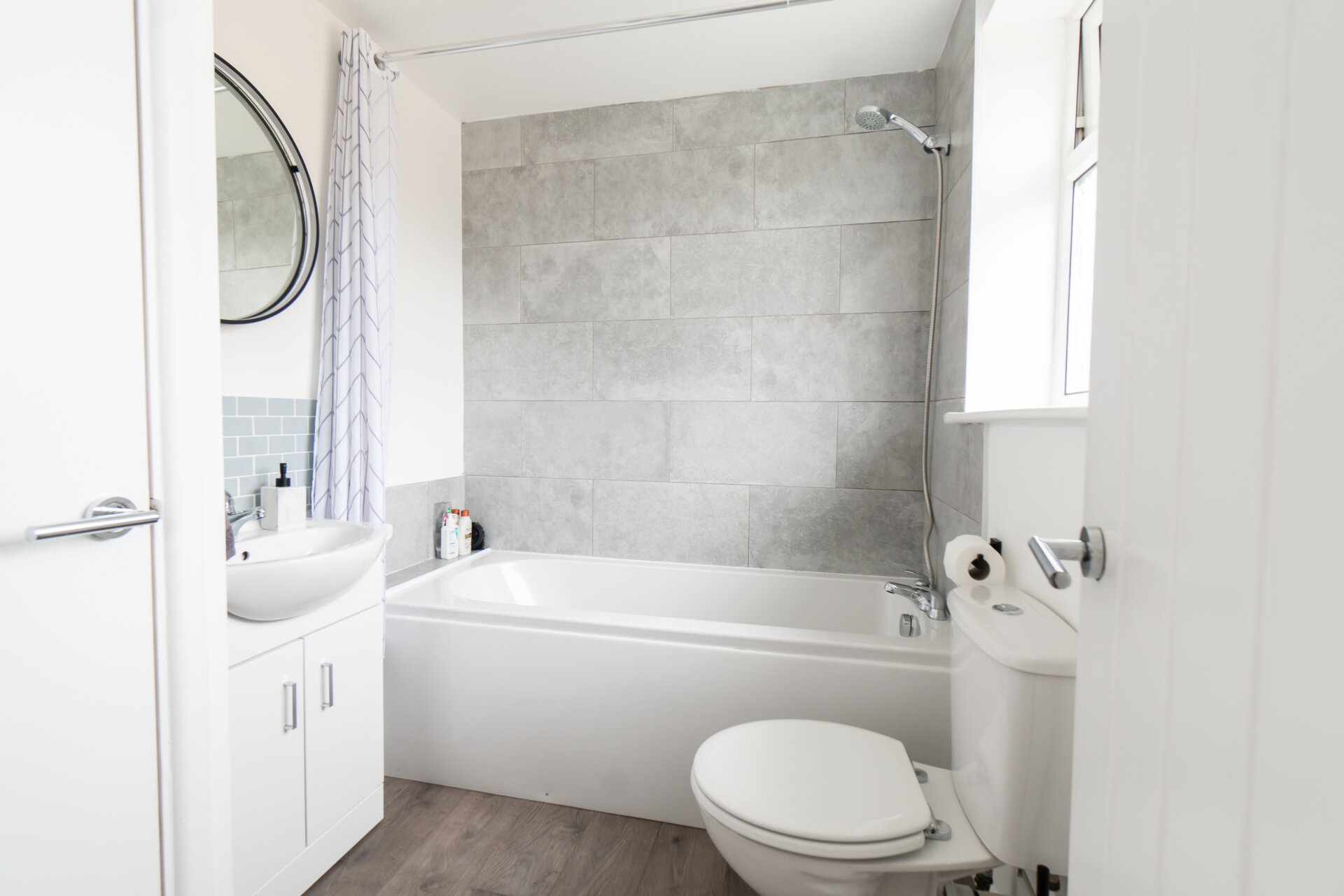 A white three piece suite comprising a panelled bath with shower over, low flush w.c, sink with storage underneath, tiled walls and splash backs, laminate floor, airing cupboard housing the gas central heating boiler, extractor fan, radiator and UPVC double glazed window to the rear.