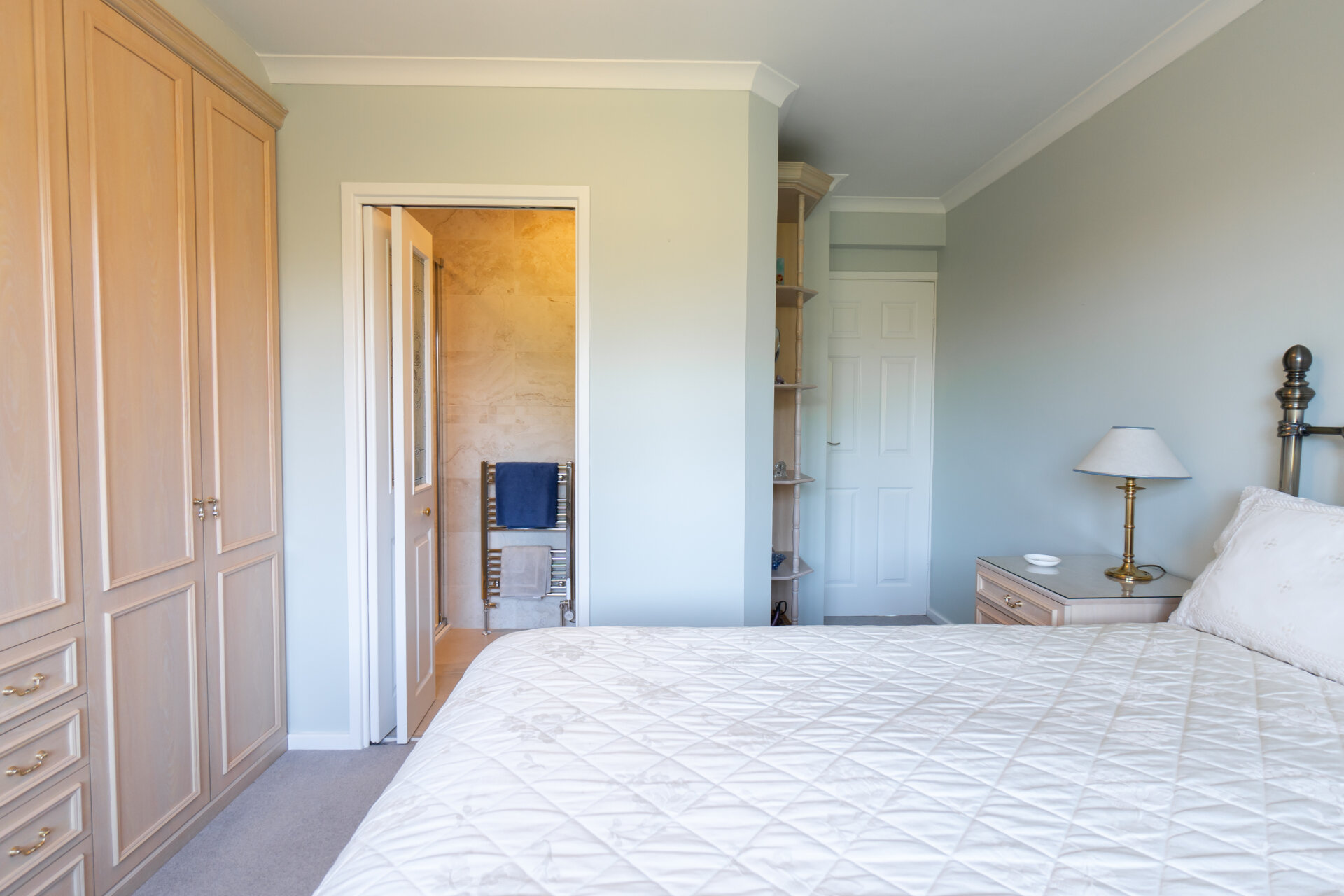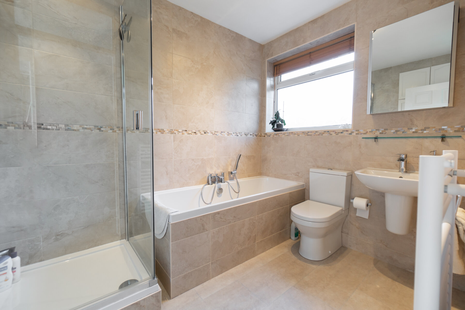 A luxurious four piece suite bathroom comprising of a walk-in shower cubicle with an electric shower, double ended bath with side mixer tap and handheld shower attachment, a wall hung wash hand basin and a low level flush WC, tiled walls and splashbacks, heated dual fuel towel rail, UPVC double glazed window to the rear and a large built-in airing cupboard housing the water tank.