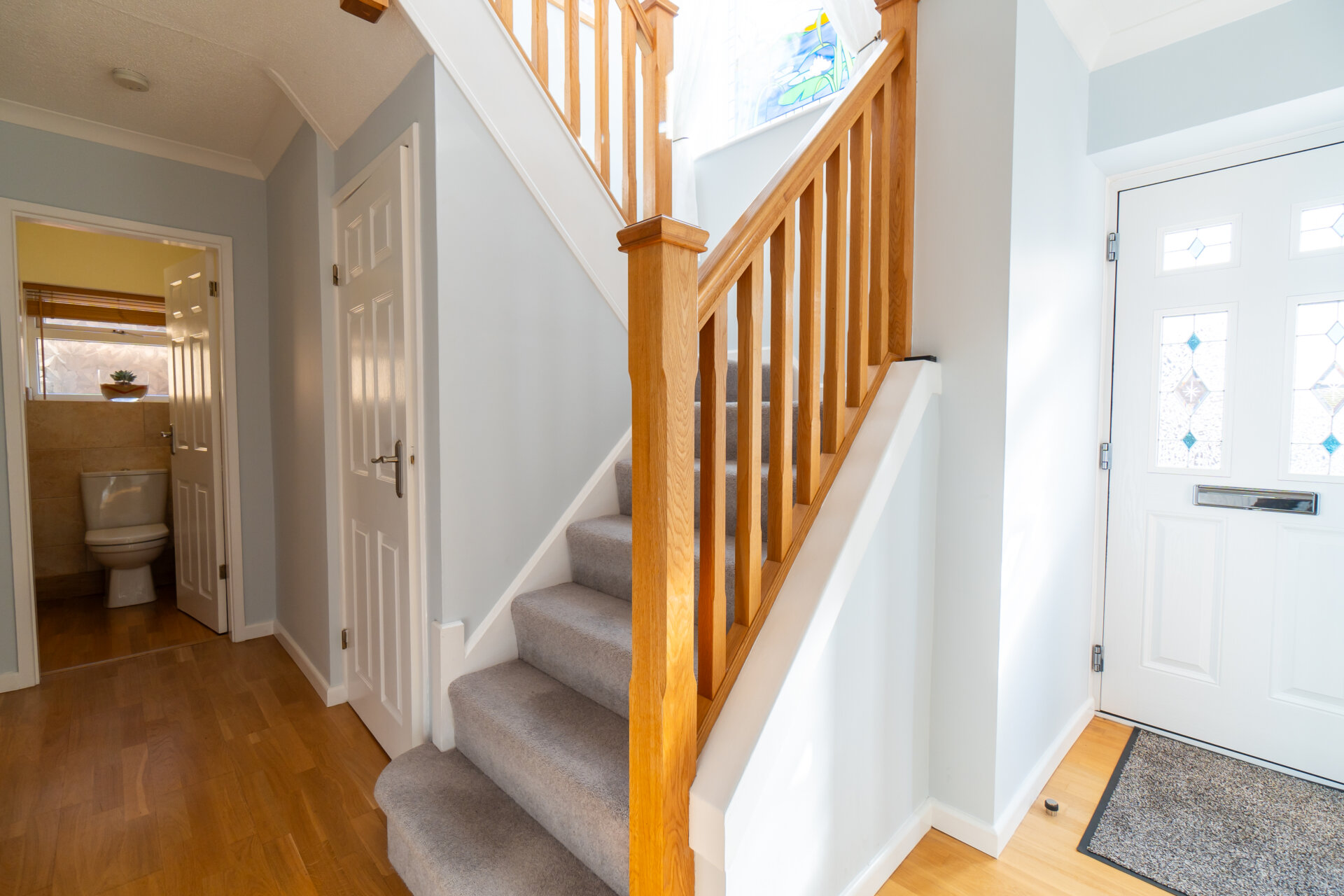 Composite front entrance door, dog leg staircase with oak stair banister to the first floor landing, solid wood oak floor, radiator, coving to the ceiling, door to a large understairs storage area, UPVC double glazed window and doors to