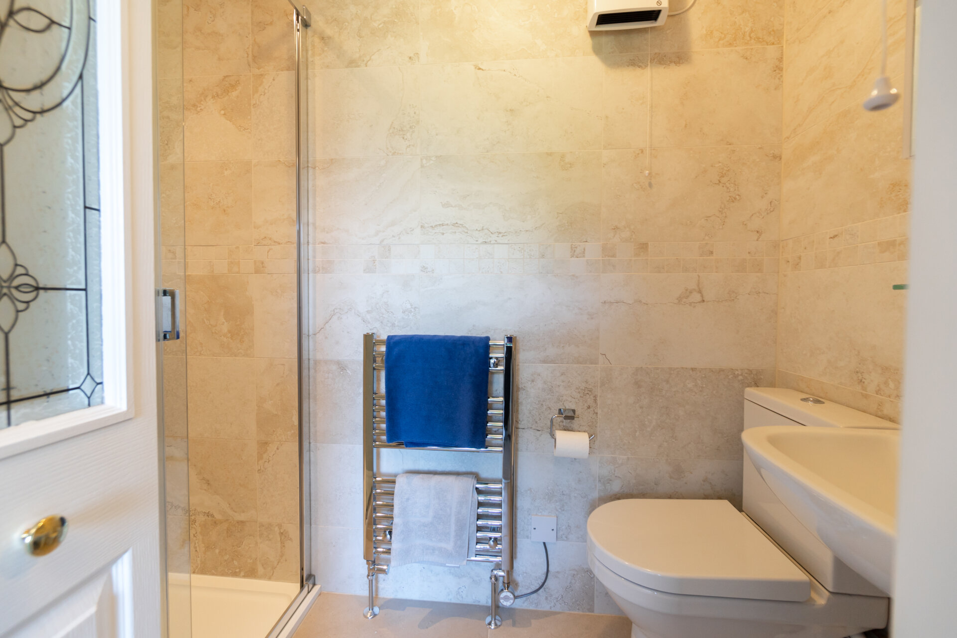 Walk-in shower unit with power shower, low flush w.c, pedestal wash hand basin, fully tiled walls and splashbacks, chrome heated dual fuel towel rail, porcelain tiled floor and extractor fan