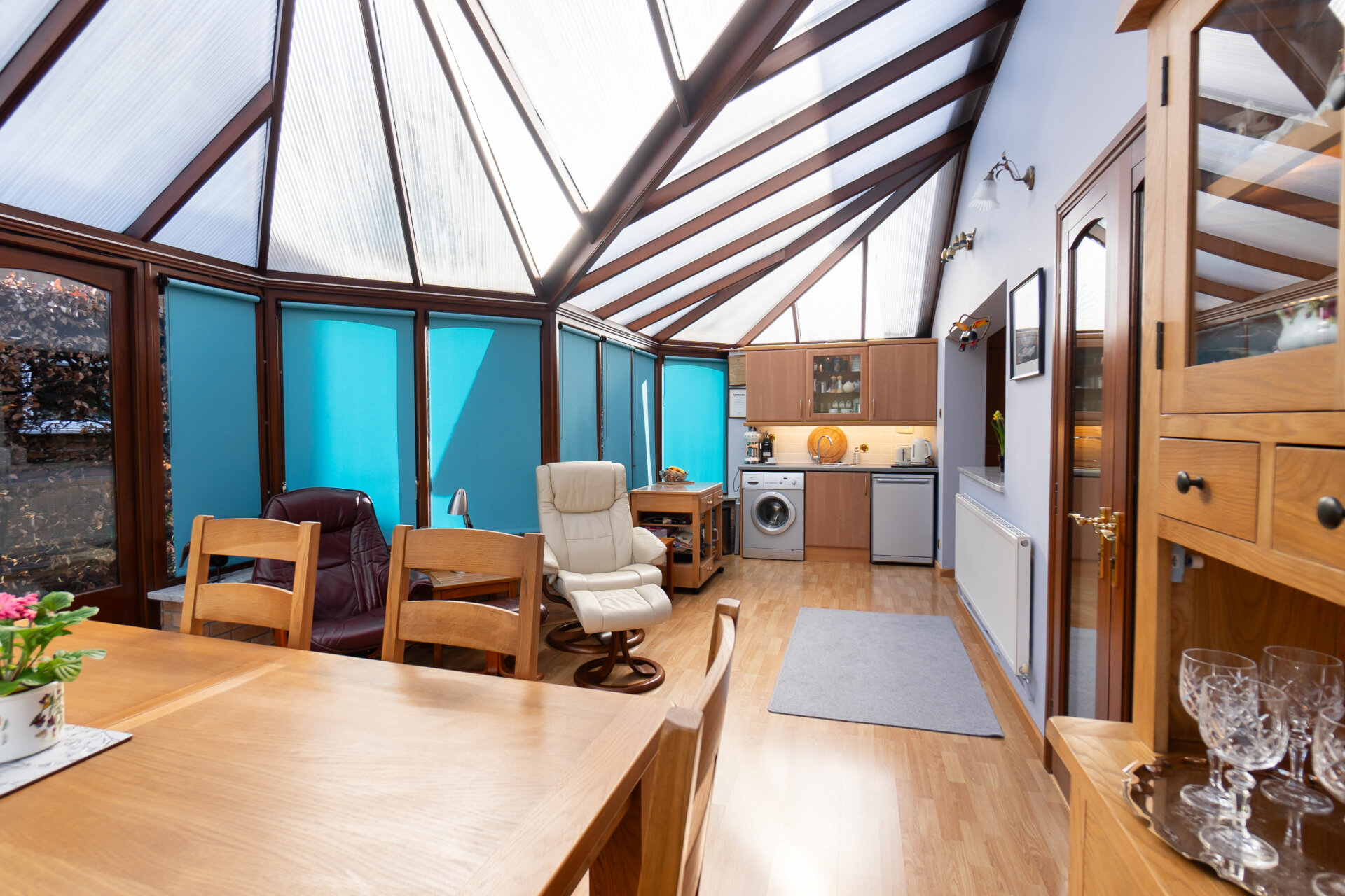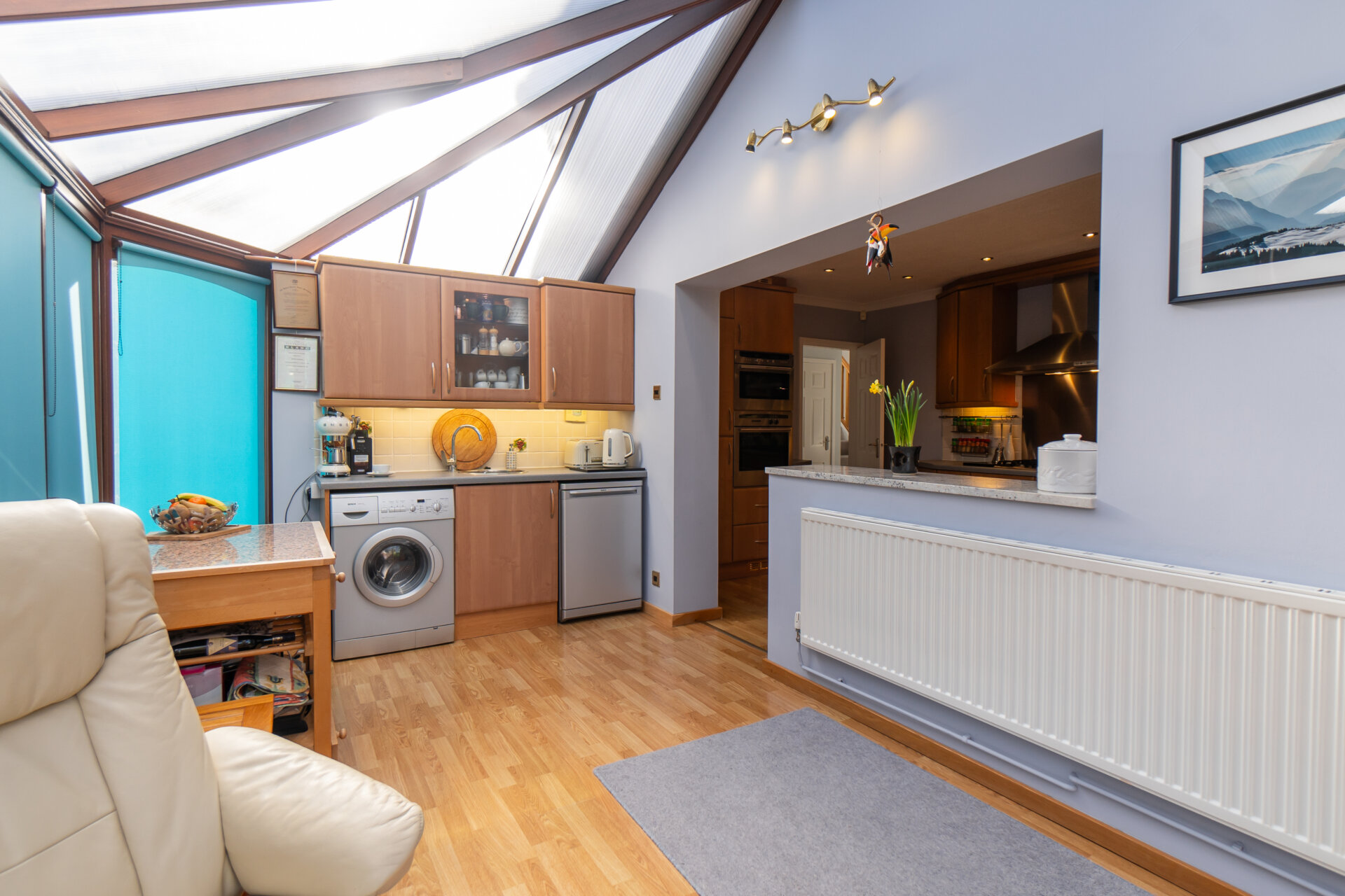 A brick base construction with granite sills, double glazed windows having fitted blinds and a polycarbonate roof. Double doors, wooden effect laminate flooring throughout and a number of wall light points and a number of power points, TV point and wall light points. At the far end of this room is a utility area that has a sink with a mixer tap and acrylic working surface. Tiled walls and splashbacks and there is a base unit with matching wall and display cupboards above, plumbing for an automatic washing machine and appliance space, radiator, laminate floor, cupboard housing the boiler.