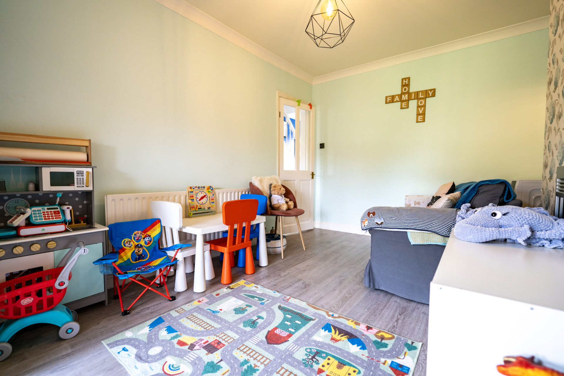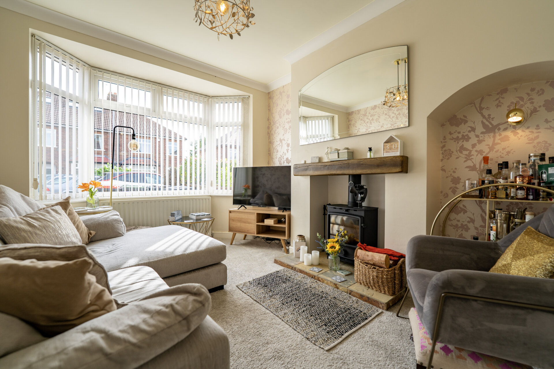 UPVC double glazed bay window to the front, log burner with a tiled hearth, TV point, radiator, coving to the ceiling.