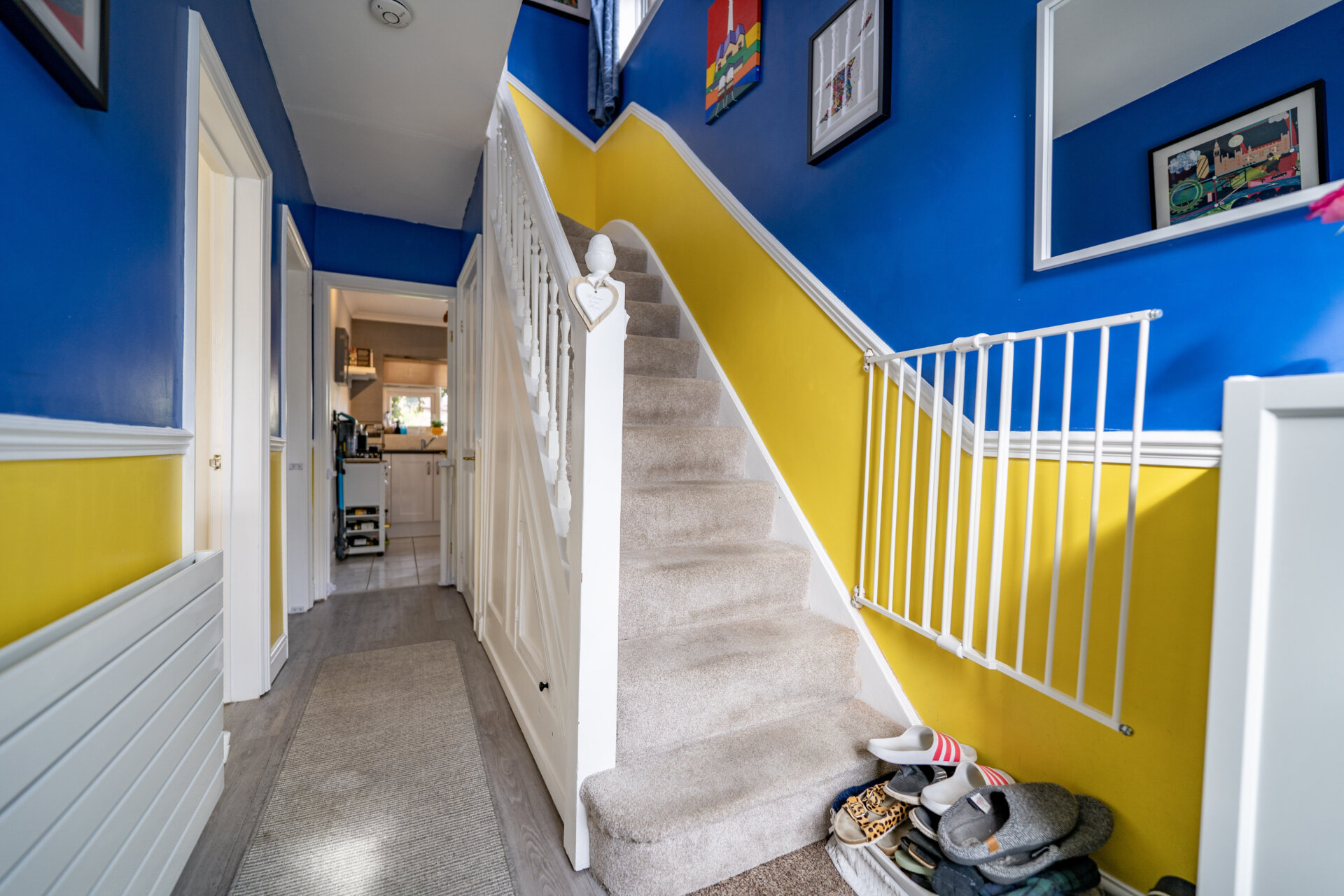 Stairs to the first floor landing, UPVC double glazed front entrance door, designer radiator, understairs storage, luxury vinyl tiled floor and door
