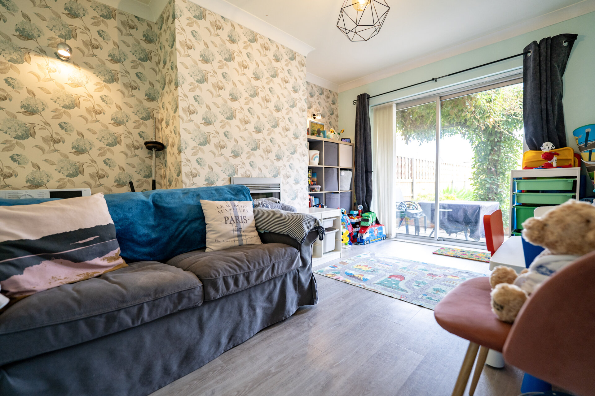 Radiator, luxury vinyl tiled floor, siding doors to the rear garden and coving to the ceiling.