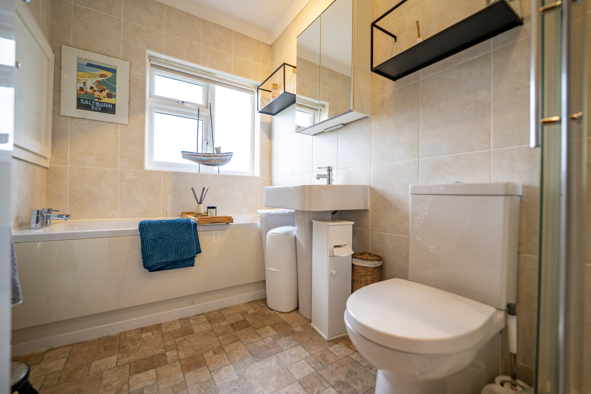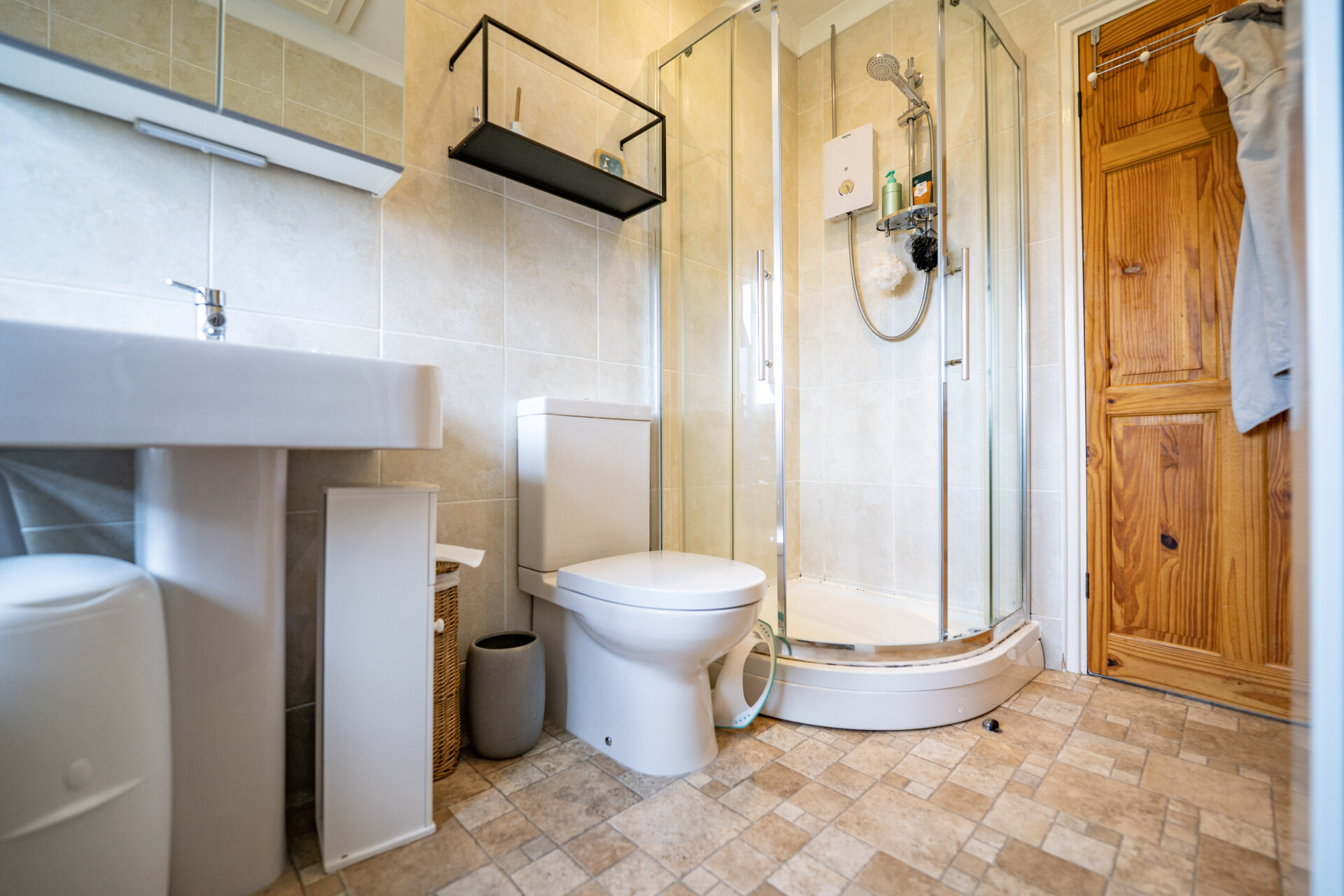 A four piece suite comprising a walk-in shower cubicle with electric shower, panelled bath, low flush w.c, sink, fully tiled walls and splashbacks, spotlights, coving to the ceiling, extractor fan, UPVC double glazed window.