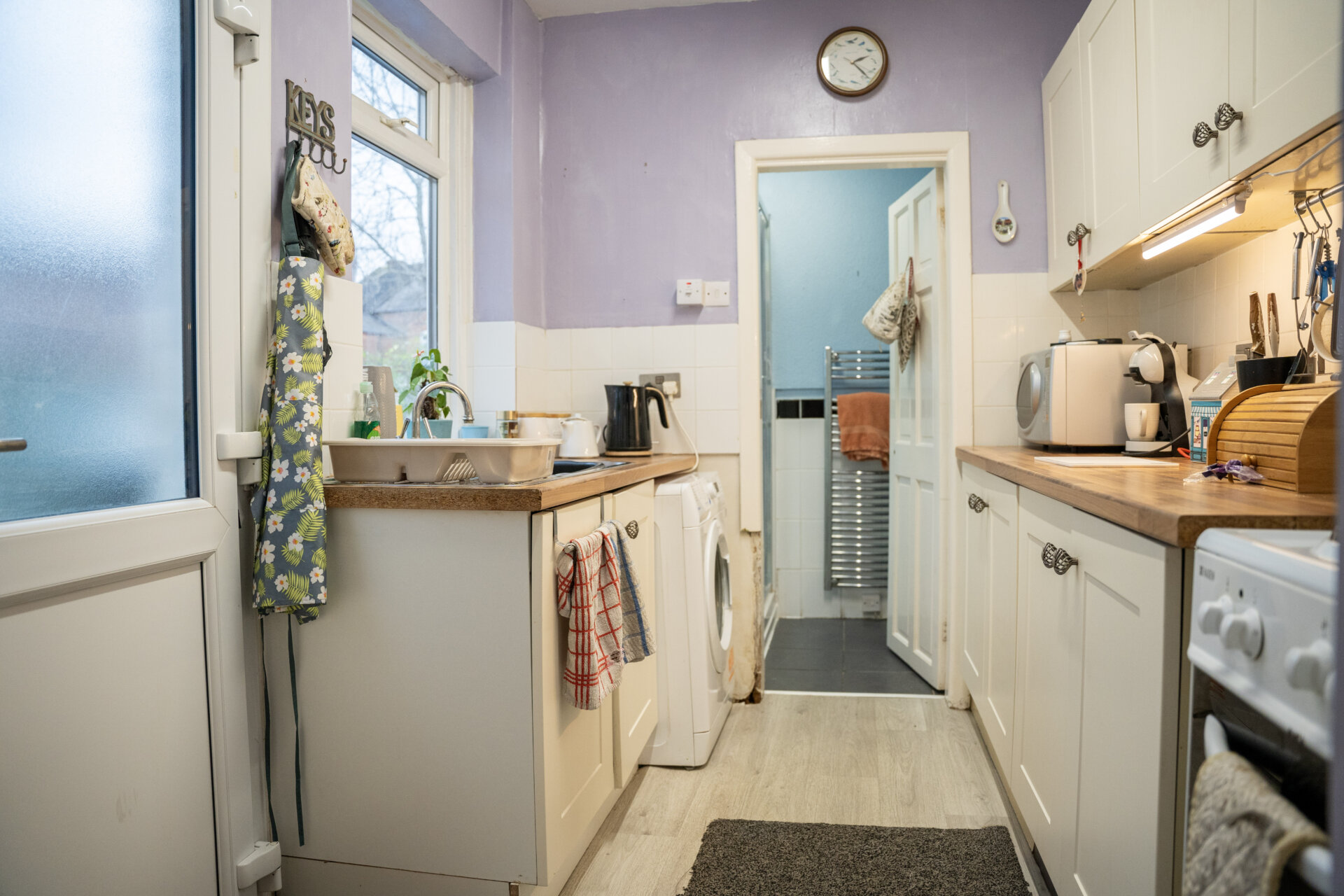 Wall, base and drawer cupboards with work surface, stainless steel sink and drainer unit with mixer tap over, tiled walled splashbacks, appliance space, plumbing automatic washing machine, rear exit door, UPVC double glazed window and door to