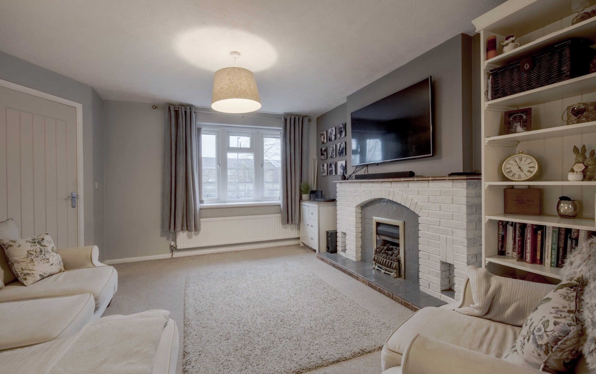 UPVC double glazed window to the front, door to understairs storage, gas fire with brick surround and tiled hearth and open to