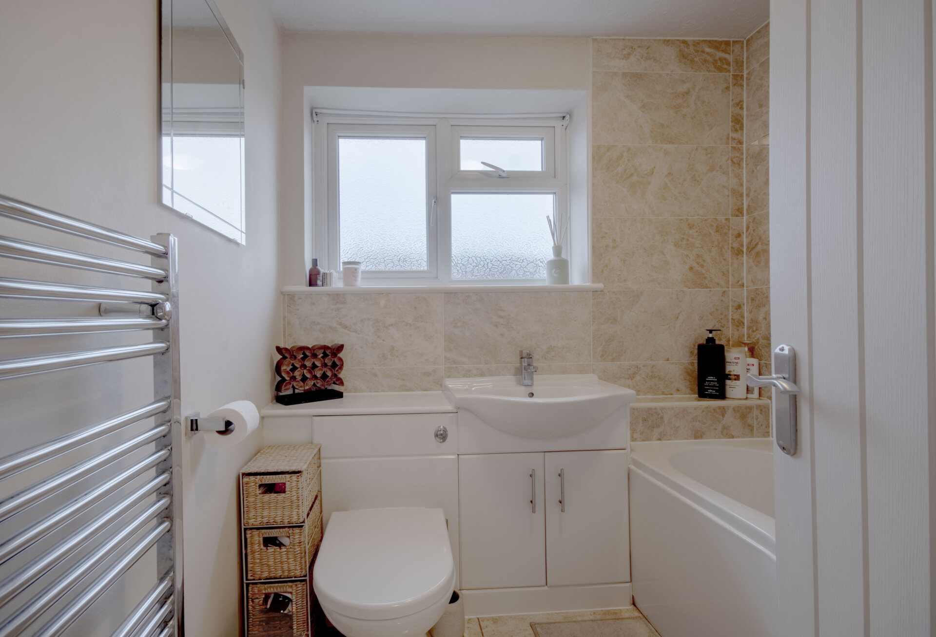P-shape bath with shower from the mains, vanity unit with low flush w.c, sink and storage, chrome heated towel rail, tiled walls ad splashbacks, UPVC double glazed window.