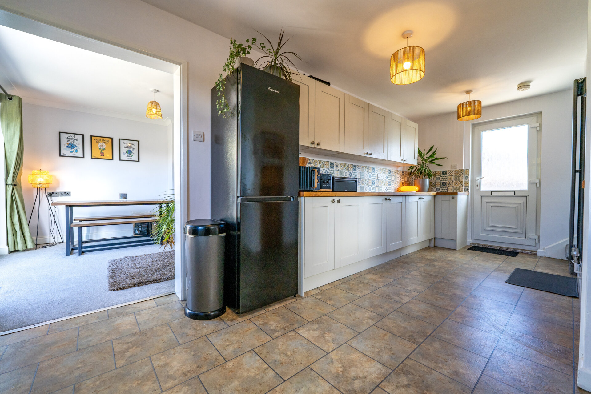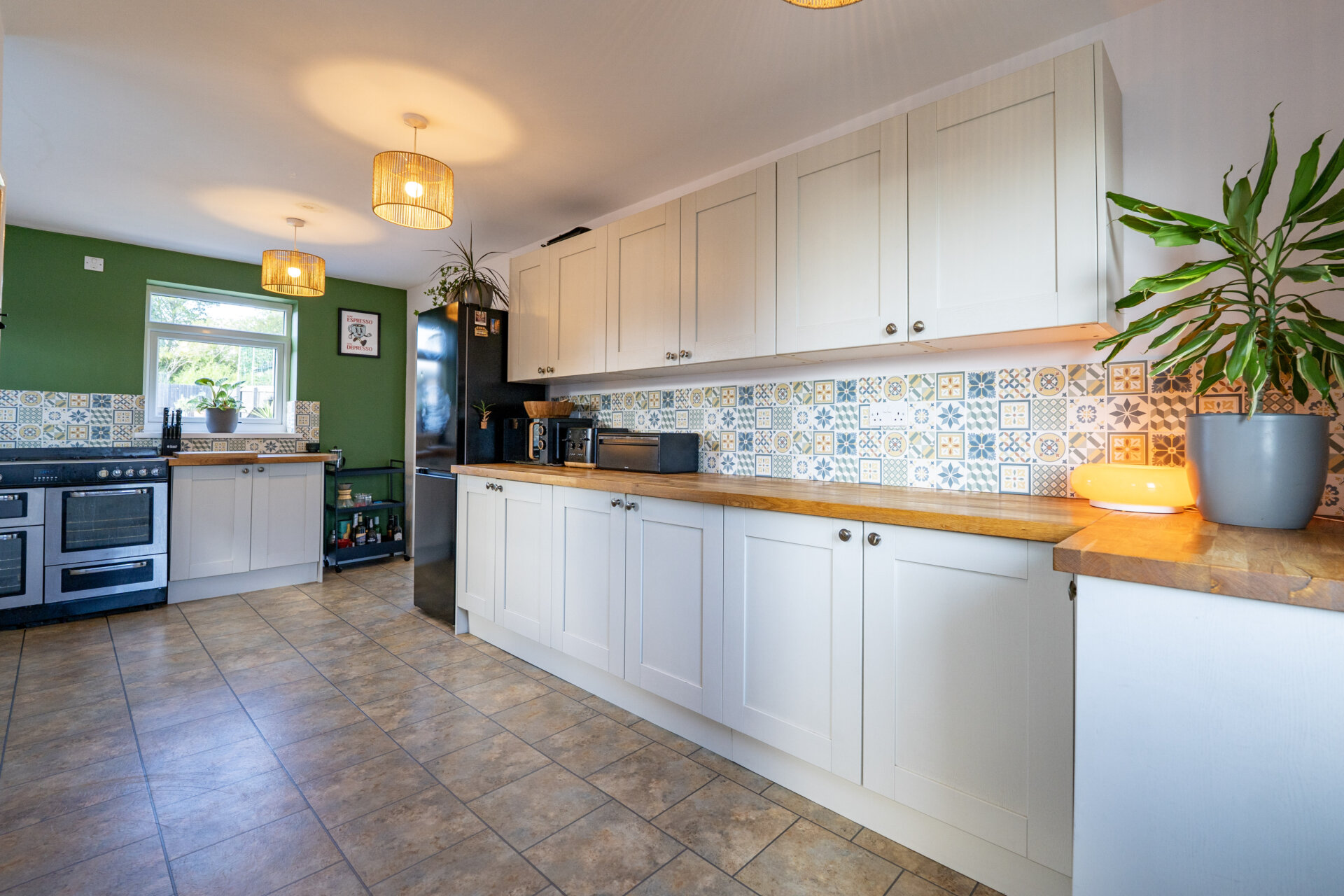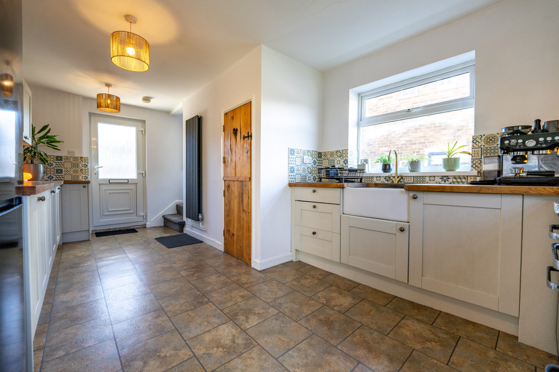 Wall, base and drawer units with Wood work surface over, tiled walls and splashbacks, Belfast sink with Gold mixer tap over, UPVC double glazed window x2, UPVC double glazed front entrance door, space for a Range cooker, for to understairs storage, stairs to the first floor landing, vertical modern radiator and open to the Lounge.