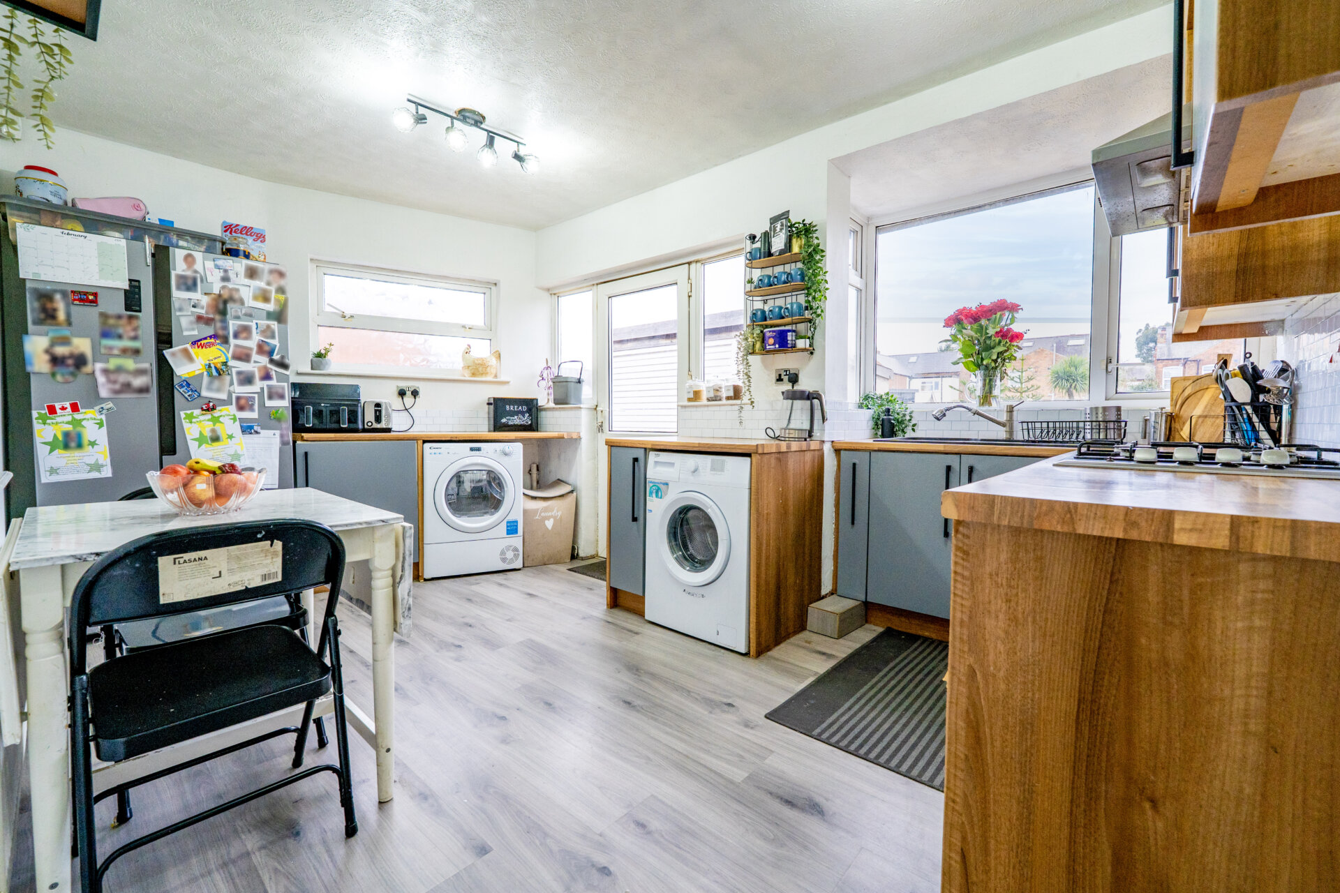 Wall, base and drawer units with work surface over, inset sink/waste/drainer unit with mixer tap over, tiled walls and splashbacks, appliance space, plumbing for automatic washing machine, built-in oven, gas hob and extractor hood over, x2 UPVC double glazed windows and rear exit door.