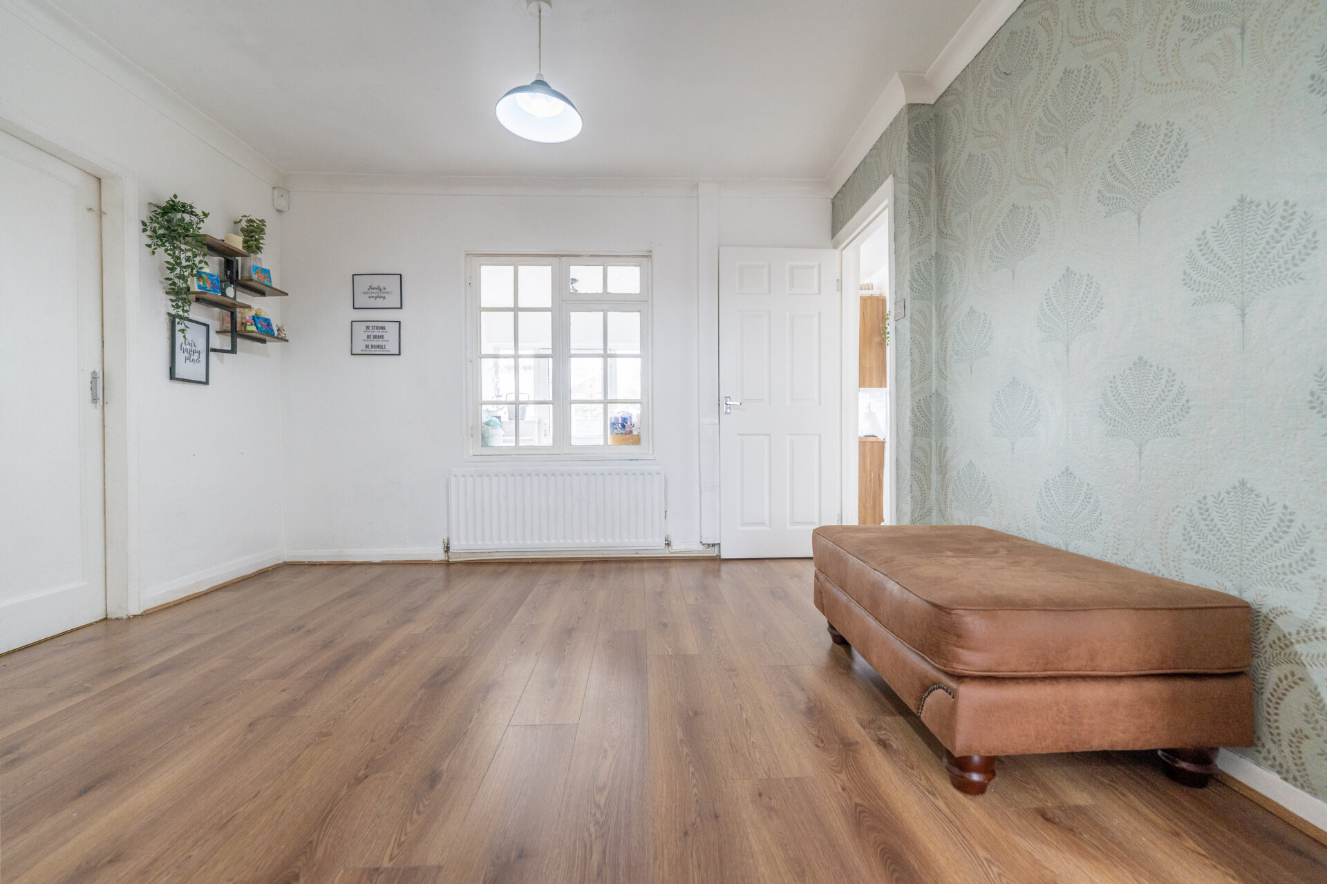 Door to storage cupboard housing the as central heating boiler, window to the kitchen, laminate floor, radiator and door to the kitchen.
