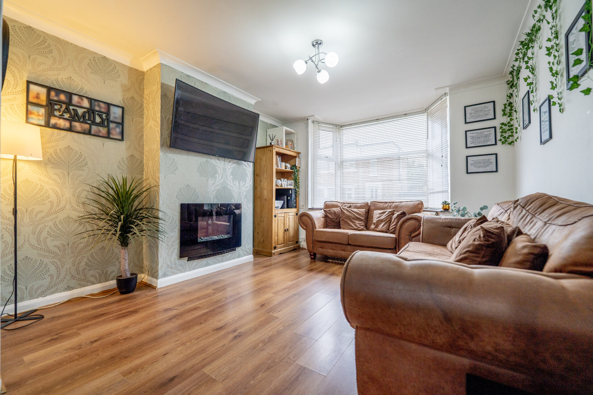 UPVC double glazed bay window, laminate floor, coving to the ceiling, radiator and open to the dining area.