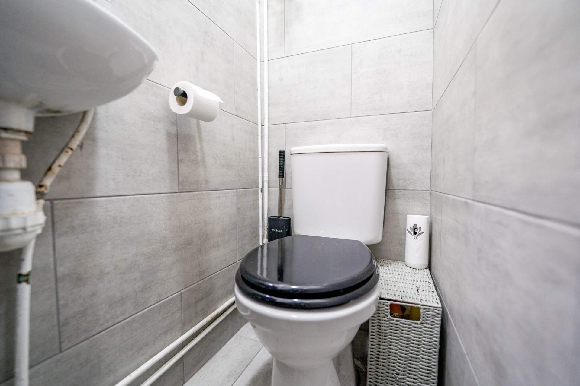 Low flush w.c, sink, tiled walls and splashbacks, tiled floor, UPVC double glazed window.