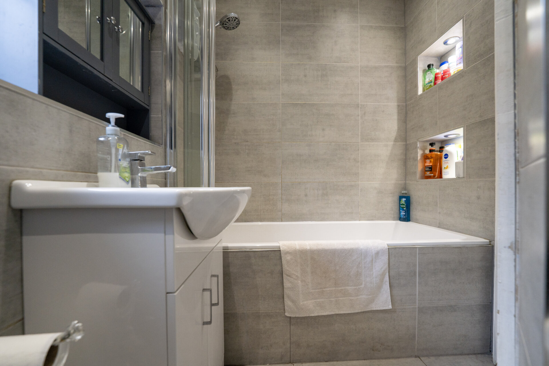 A recently re-fitted bathroom comprising a panelled bath with electric shower over, sink with storage, low flush w.c, fully tiled walls and splashbacks, extractor fan, recess shelving, tiled floor, spotlights, UPVC double glazed window.