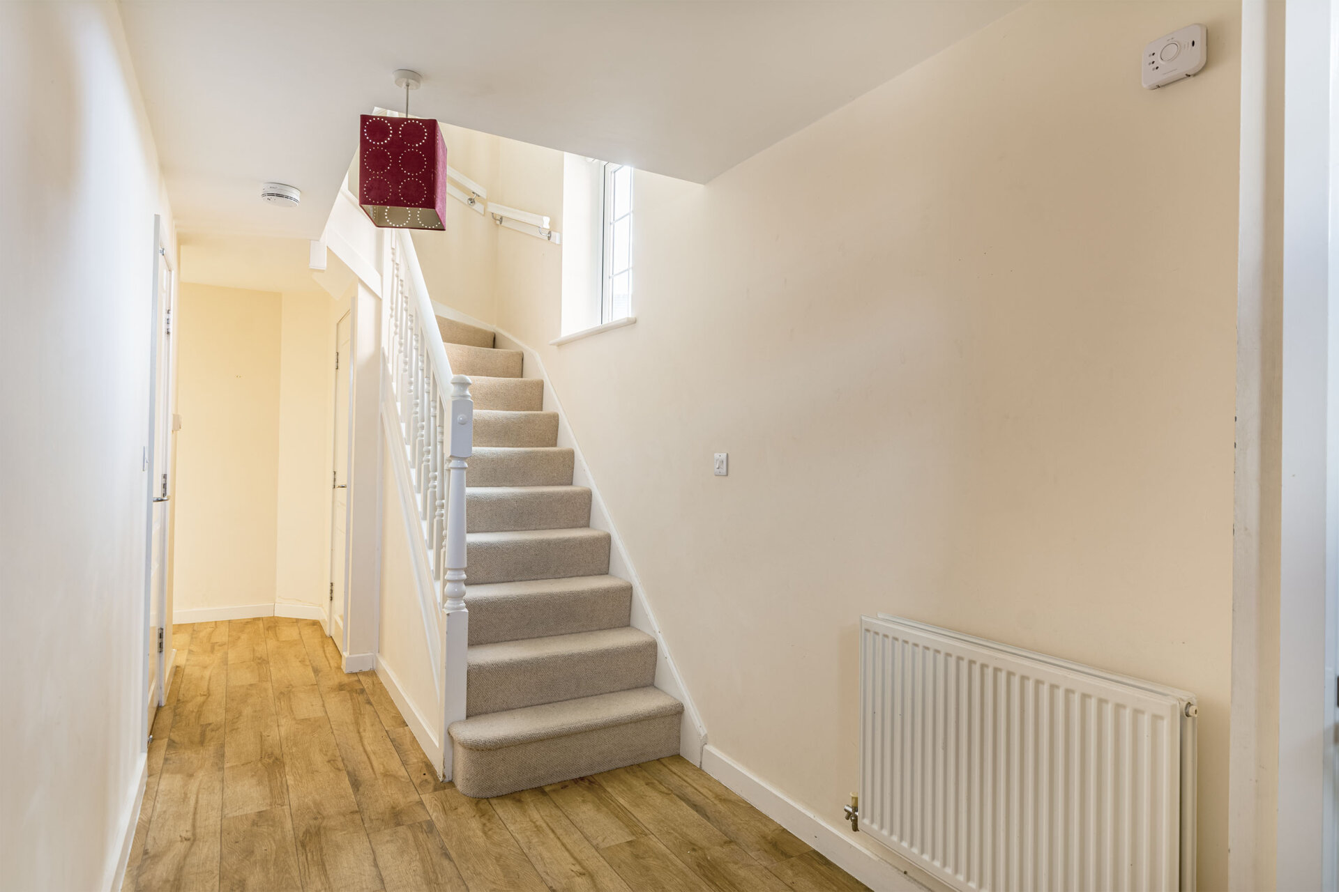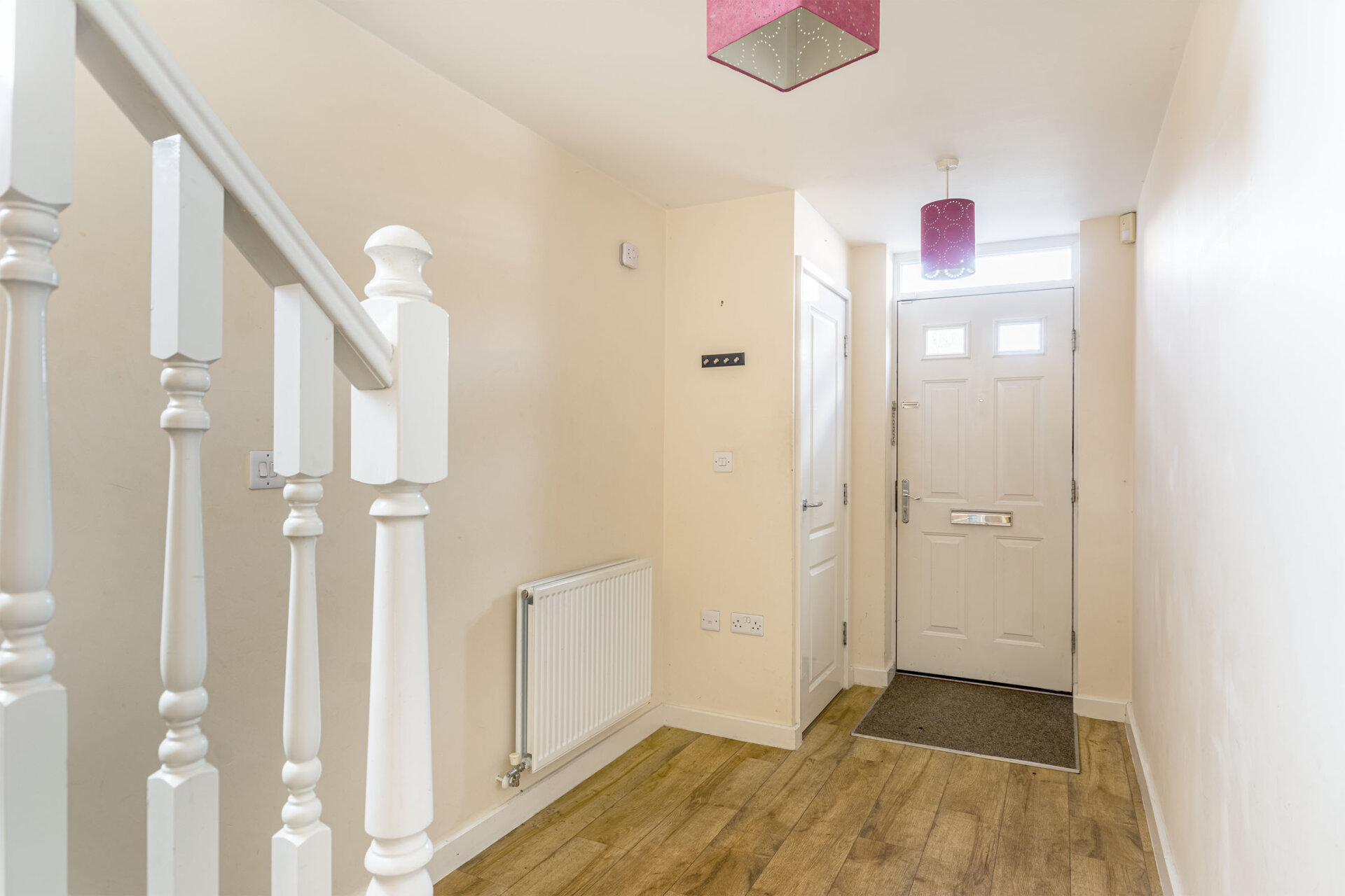 Front entrance door, radiator, stairs to the first floor landing, two storage cupboards, door to garage, UPVC double glazed front entrance door and doors to