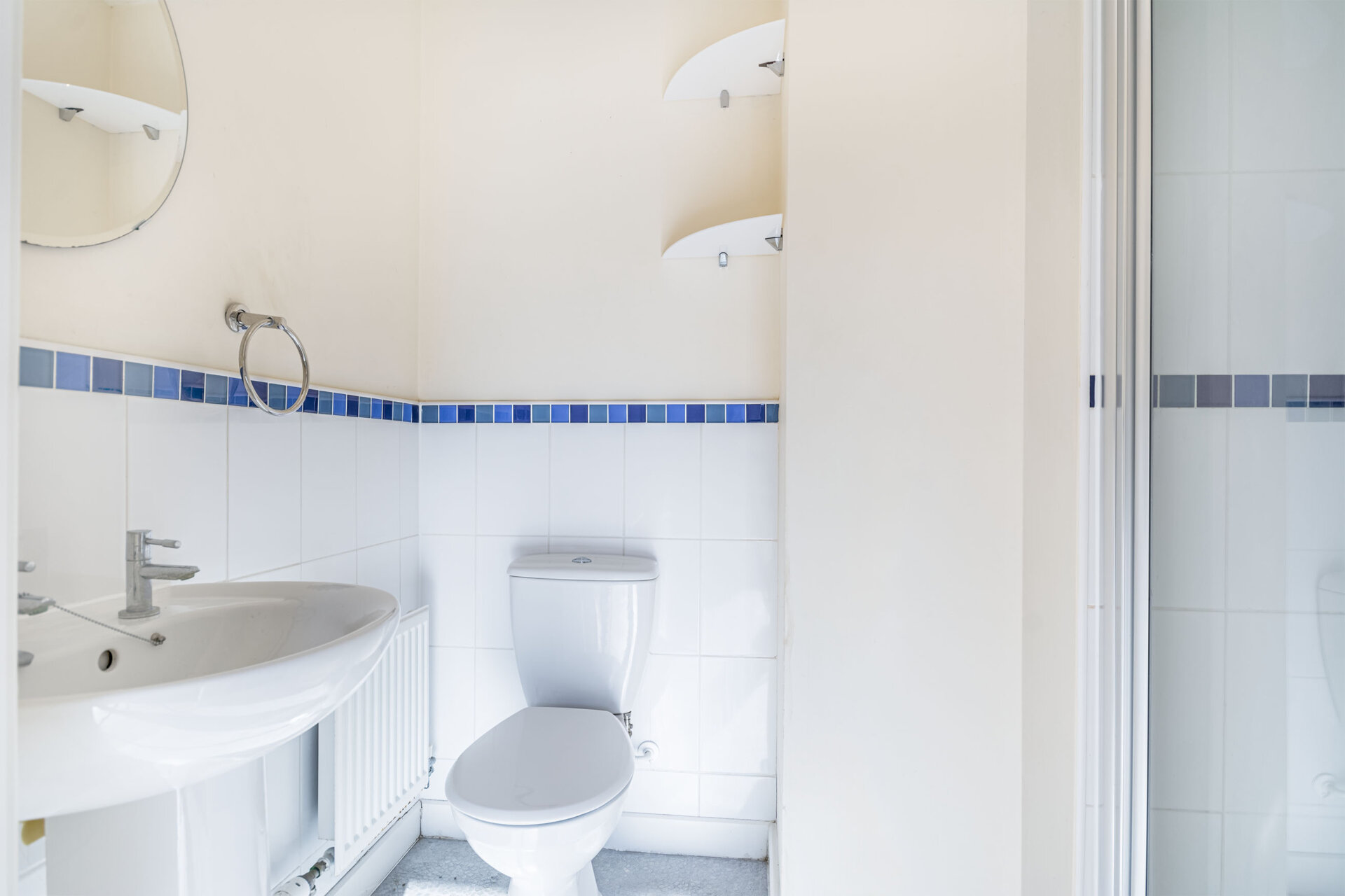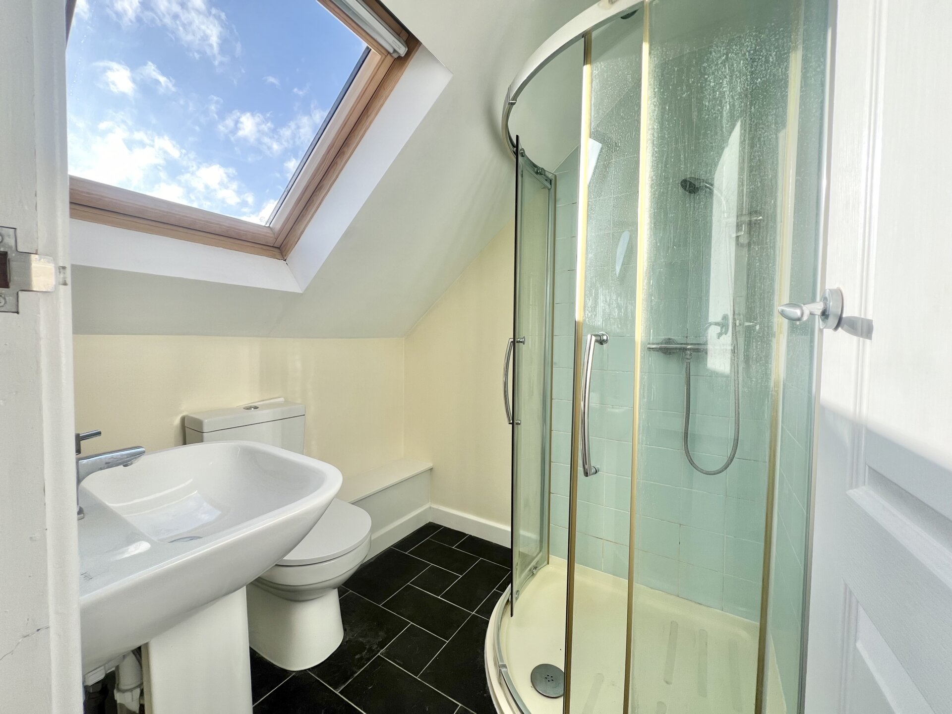 Walk-in shower cubicle with shower from the mains, low flush w.c, pedestal wash hand basin, tiled walls and splashbacks, radiator, extractor fan.