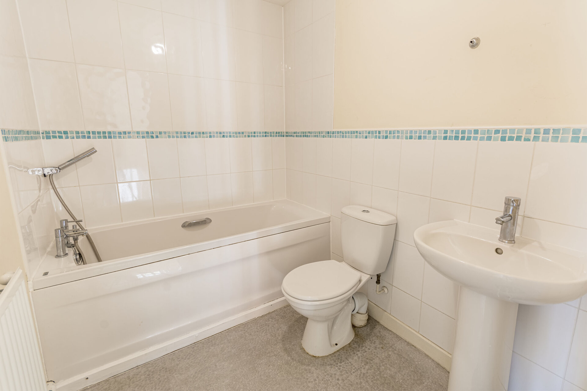 Panelled bath with hand held shower head, low flush w.c, pedestal wash hand basin, radiator, tiled walls and splashbacks, extractor fan, shaver point.