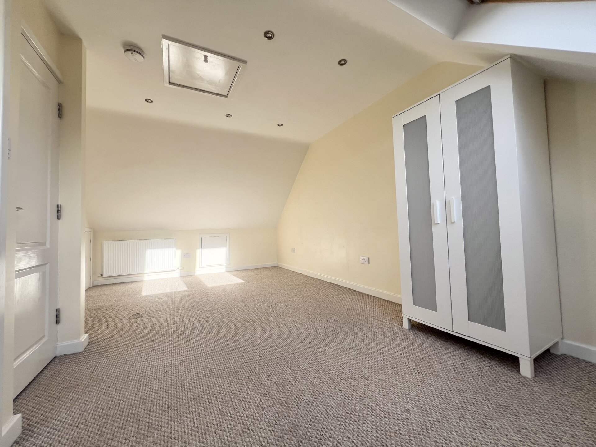 UPVC double glazed window to the rear, storage in the eaves, radiator, TV point, spotlights and door to