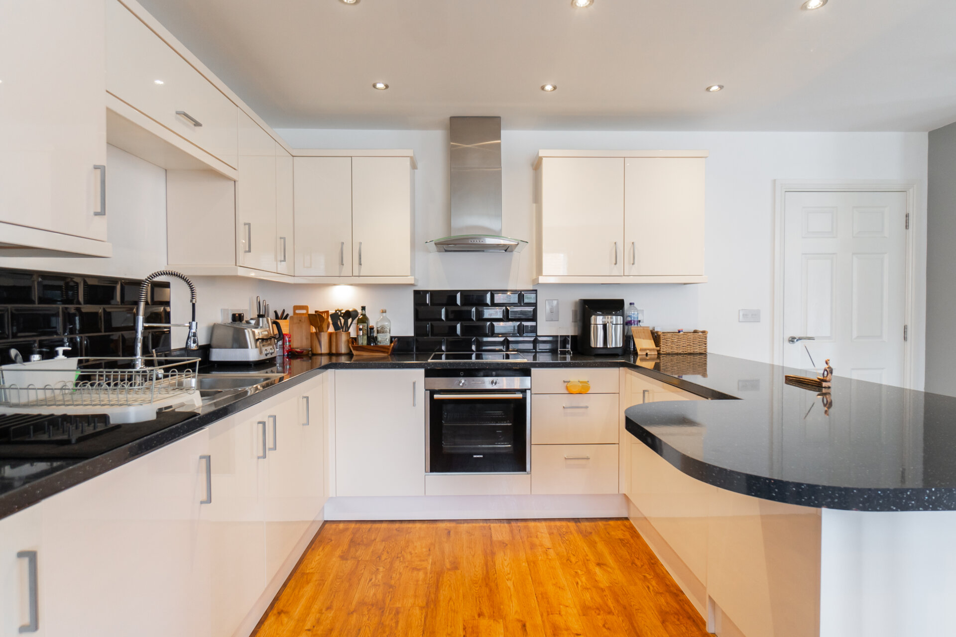 wall, base and drawer units with work surface over, integrated fridge and separate freezer, washing machine, oven with electric hob and extractor hood over, stainless steel sink and drainer unit with swan mixer tap over, tiled walls and splashbacks, Antico floor, spotlights, cupboard housing the gas central heating boiler, breakfast bar, radiator and UPVC double glazed window