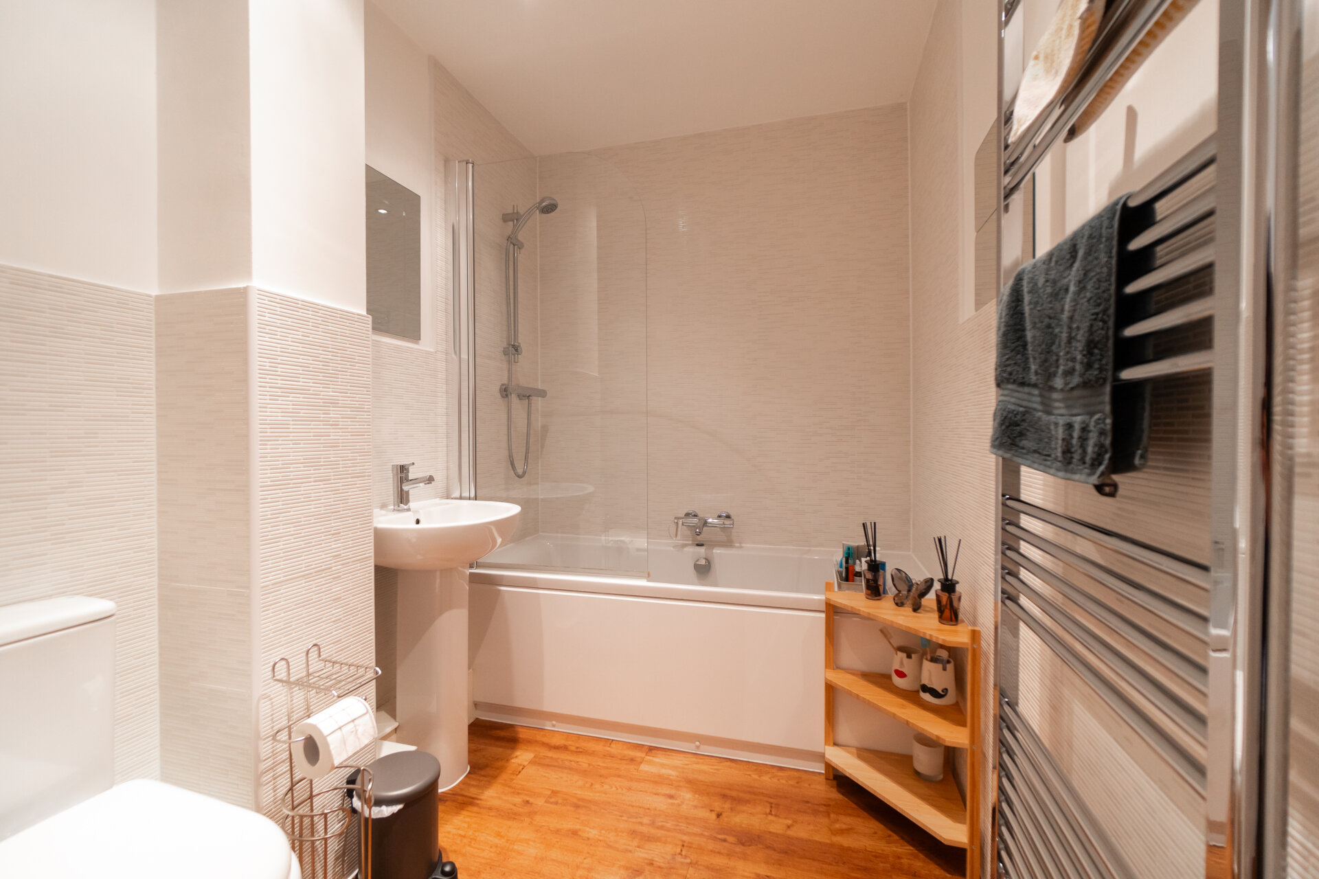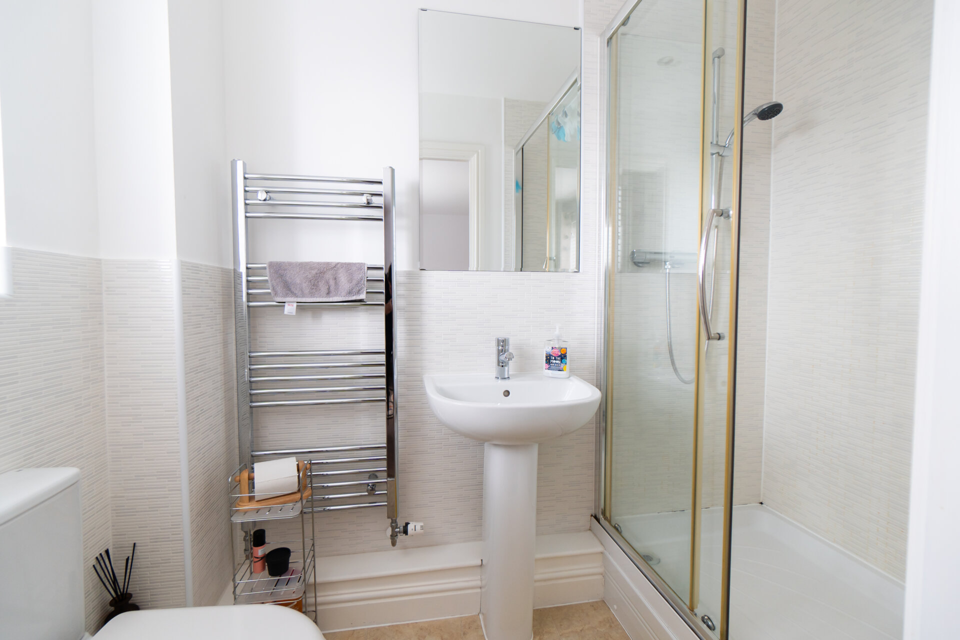 walk-in shower cubicle with shower from the mains, low flush w.c, sink, tiled walls and splashbacks, chrome heated towel rail, UPVC double glazed window and extractor fan