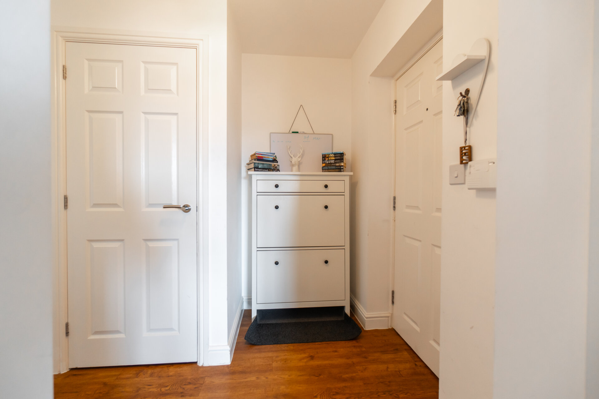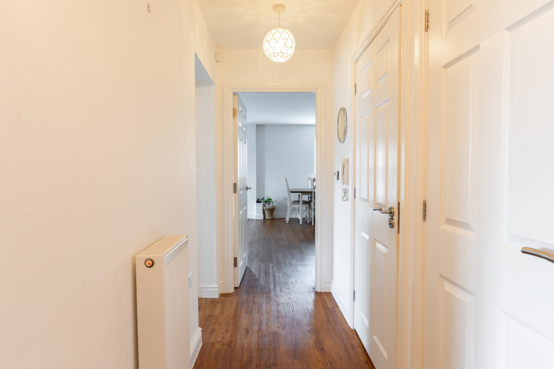 Composite front entrance door, Antico floor, door to a large storage cupboard, radiator, telecom system and doors to