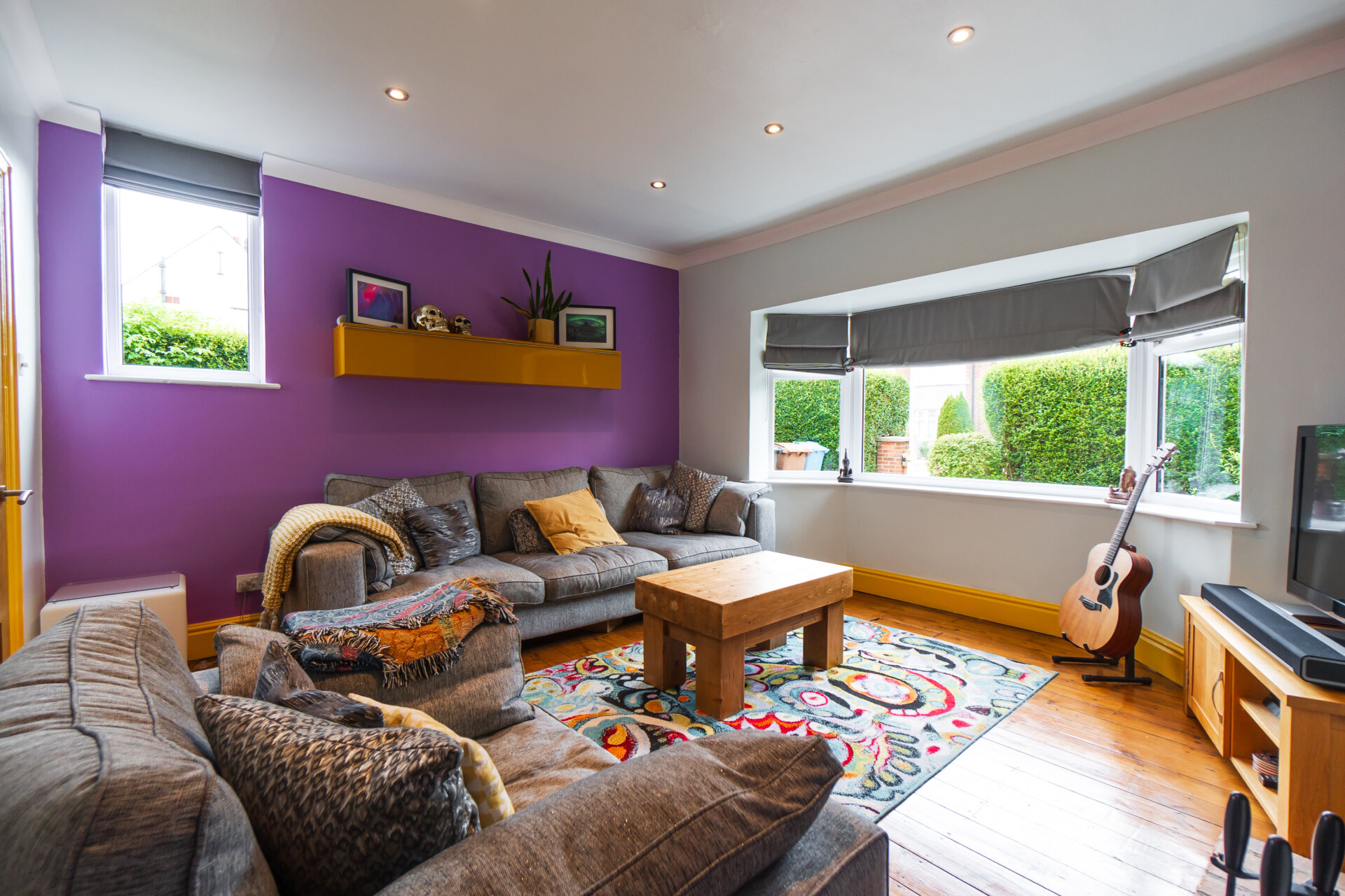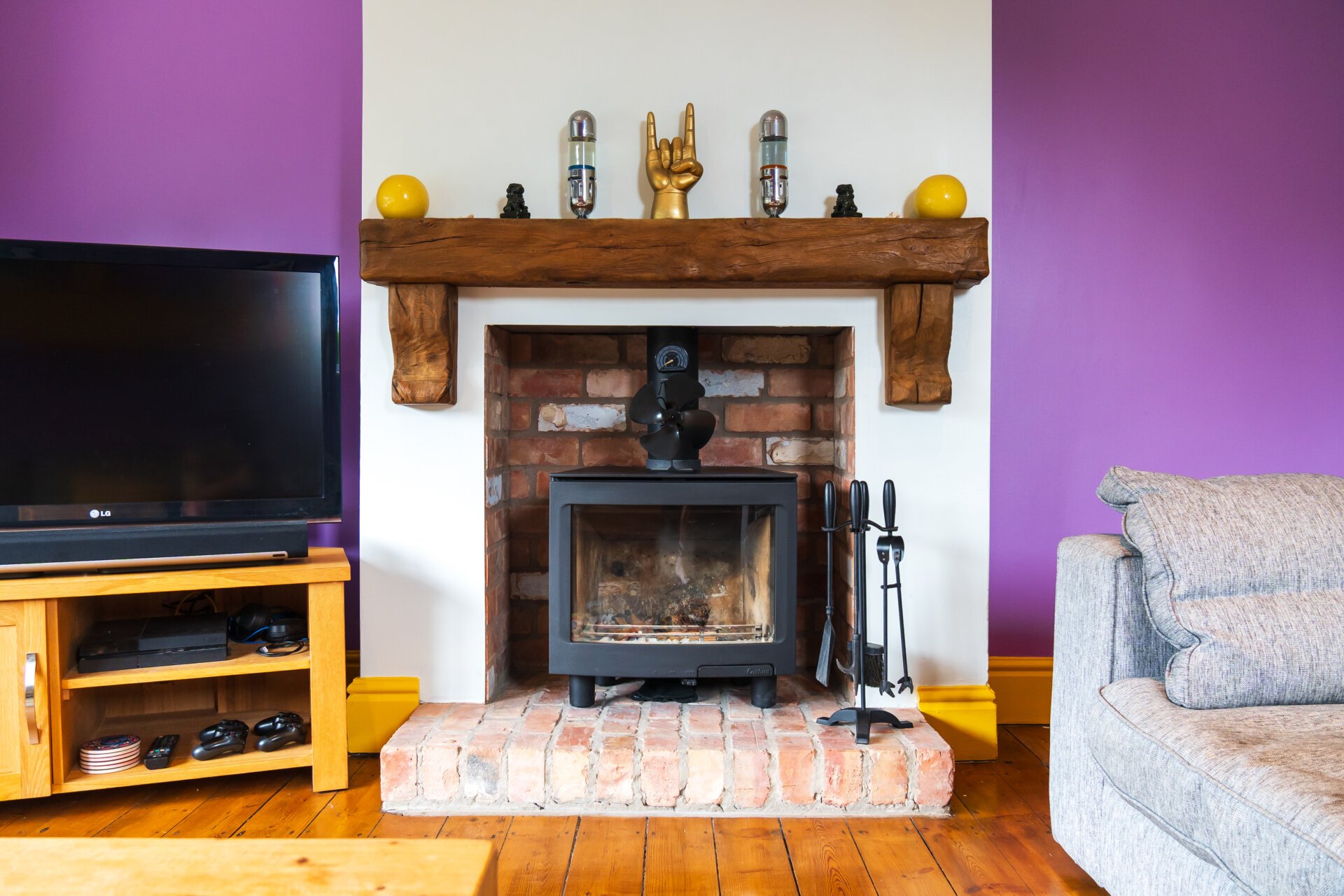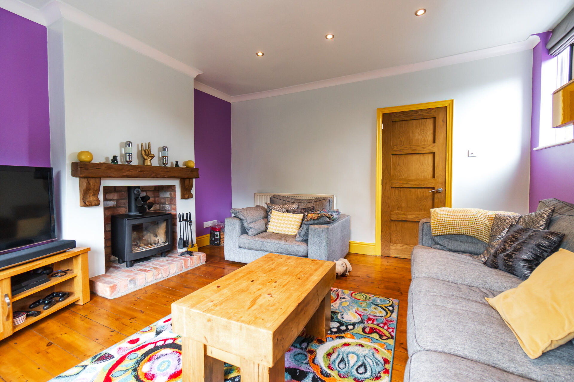 UPVC double glazed bay window to the front, and double glazed window to the side, coving to the ceiling, spotlights, exposed floor boards, radiator, log burner on exposed bricks