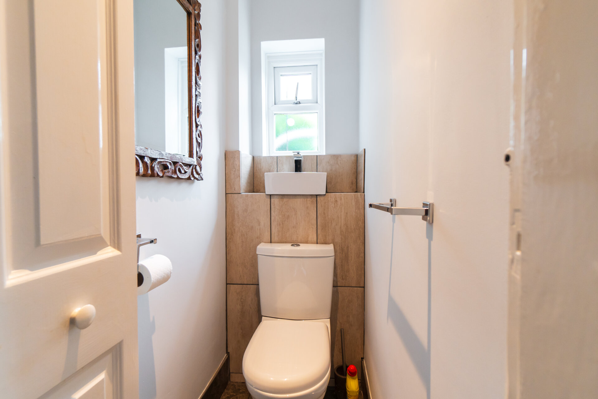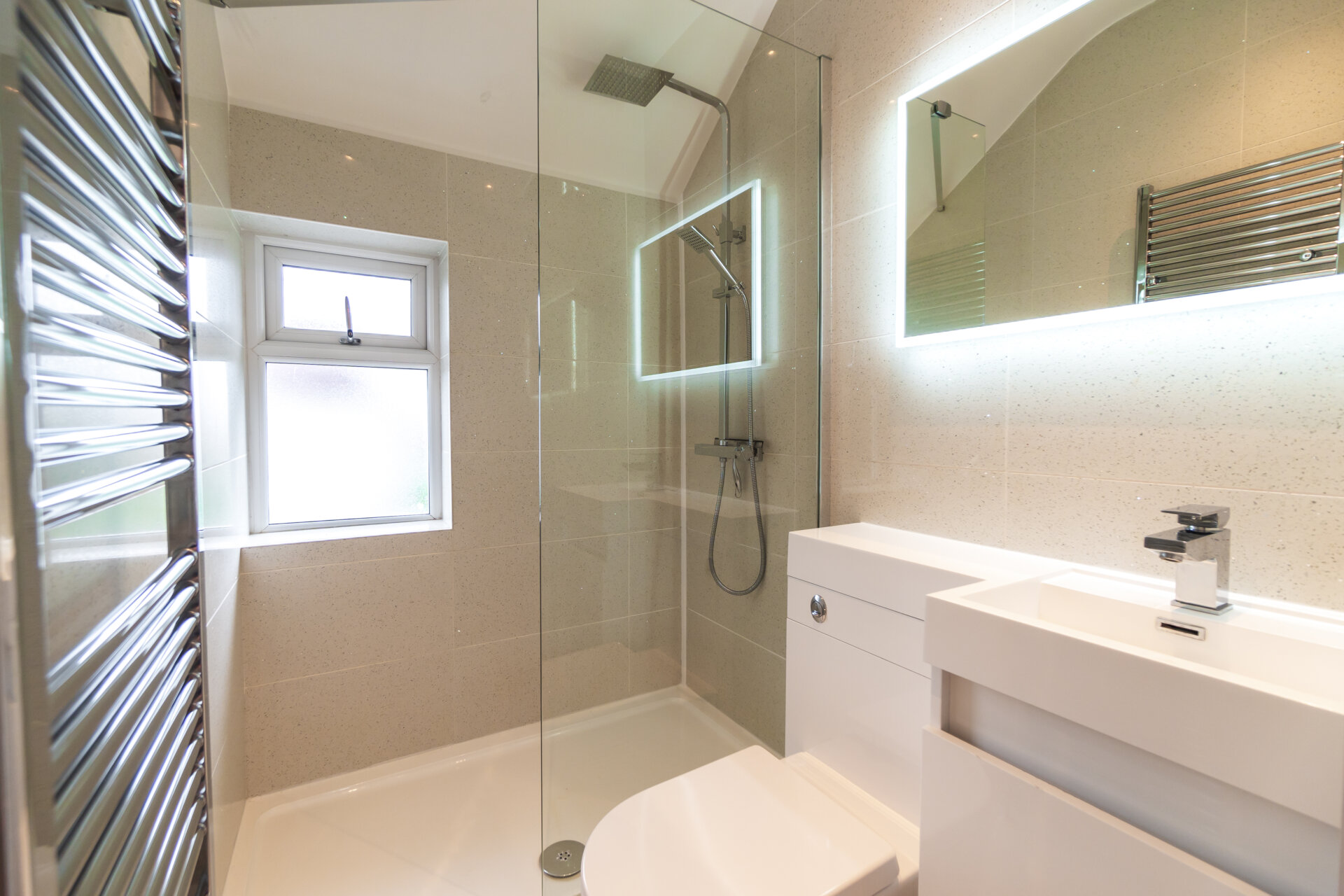 Walk-in shower cubicle with shower from the mains, low flush w.c, sink with storage, fully tiled walls and splashbacks, tiled floor, UPVC double glazed window to the side, extractor fan, spotlights and chrome heated towel rail.