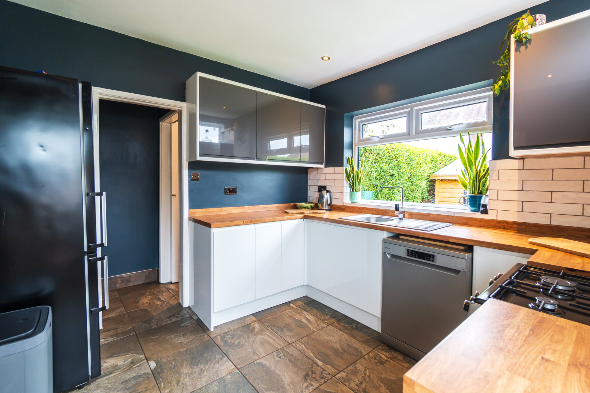 High gloss white and grey wall, base and drawer units with work surface over, stainless steel sink and drainer unit with mixer tap over, appliance space, plumbing for dishwasher, cooker space, x2 UPVC double glazed windows to the rear, tiled walls and splashbacks, tiled floor, rear exit door and door to